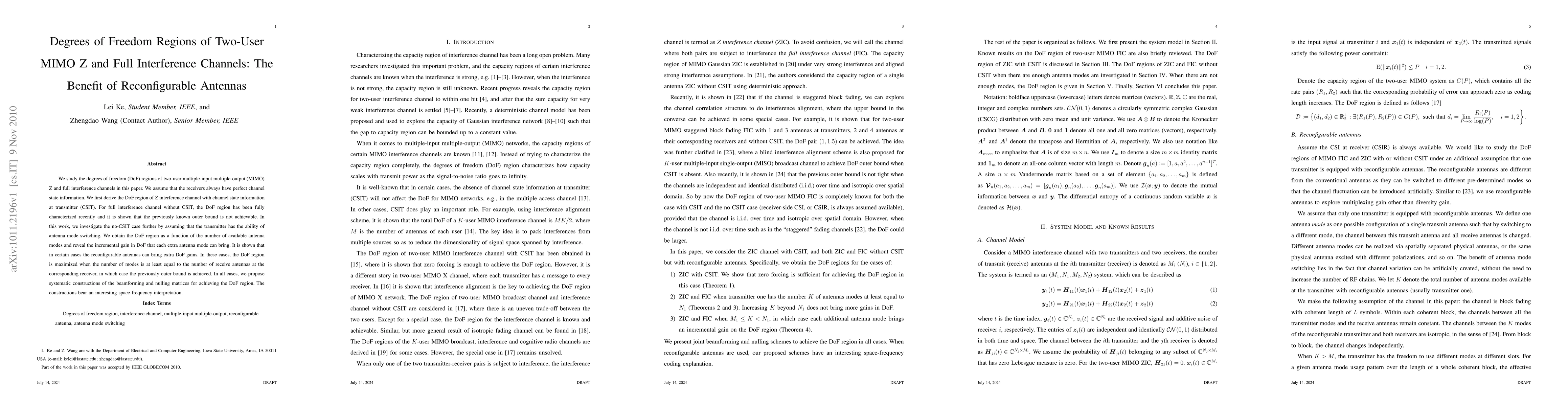 We study the degrees of freedom (DoF) regions of two-user multiple-input multiple-output (MIMO) Z and full interference channels in this paper. We assume that the receivers always have perfect channel state information. We first derive the DoF region of Z interference channel with channel state information at transmitter (CSIT). For full interference channel without CSIT, the DoF region has been fully characterized recently and it is shown that the previously known outer bound is not achievable. In this work, we investigate the no-CSIT case further by assuming that the transmitter has the ability of antenna mode switching. We obtain the DoF region as a function of the number of available antenna modes and reveal the incremental gain in DoF that each extra antenna mode can bring. It is shown that in certain cases the reconfigurable antennas can bring extra DoF gains. In these cases, the DoF region is maximized when the number of modes is at least equal to the number of receive antennas at the corresponding receiver, in which case the previously outer bound is achieved. In all cases, we propose systematic constructions of the beamforming and nulling matrices for achieving the DoF region. The constructions bear an interesting space-frequency interpretation.