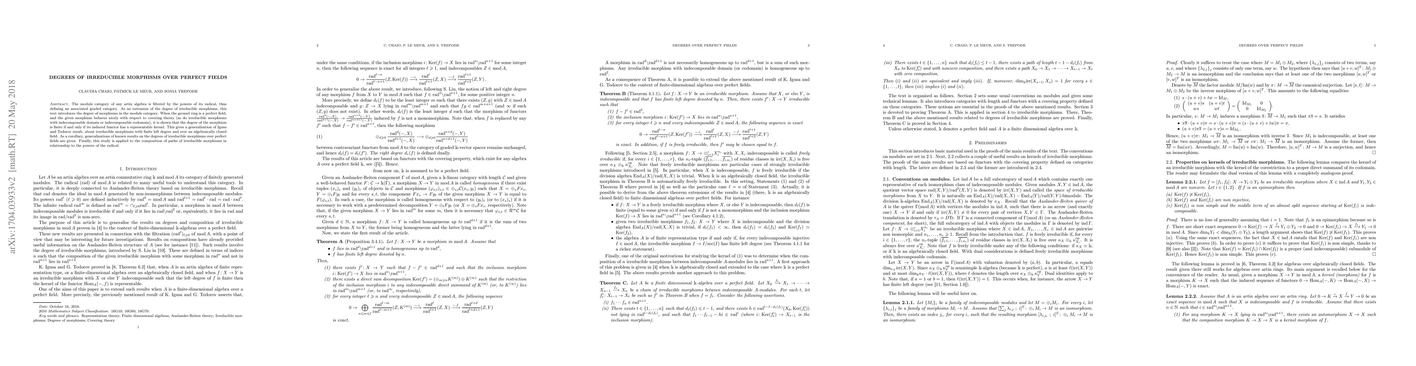 This paper explores the degree of morphisms in the module category of artin algebras over perfect fields, extending the concept of degrees of irreducible morphisms. It proves that the degree of a morphism is finite if its associated natural transformation has a representable kernel, generalizing results on irreducible morphisms.