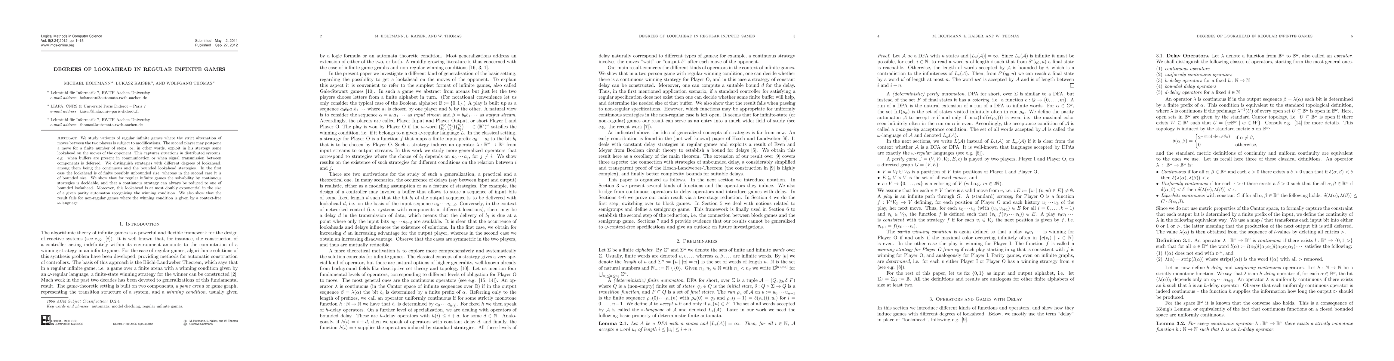 We study variants of regular infinite games where the strict alternation of moves between the two players is subject to modifications. The second player may postpone a move for a finite number of steps, or, in other words, exploit in his strategy some lookahead on the moves of the opponent. This captures situations in distributed systems, e.g. when buffers are present in communication or when signal transmission between components is deferred. We distinguish strategies with different degrees of lookahead, among them being the continuous and the bounded lookahead strategies. In the first case the lookahead is of finite possibly unbounded size, whereas in the second case it is of bounded size. We show that for regular infinite games the solvability by continuous strategies is decidable, and that a continuous strategy can always be reduced to one of bounded lookahead. Moreover, this lookahead is at most doubly exponential in the size of a given parity automaton recognizing the winning condition. We also show that the result fails for non-regular gamesxwhere the winning condition is given by a context-free omega-language.