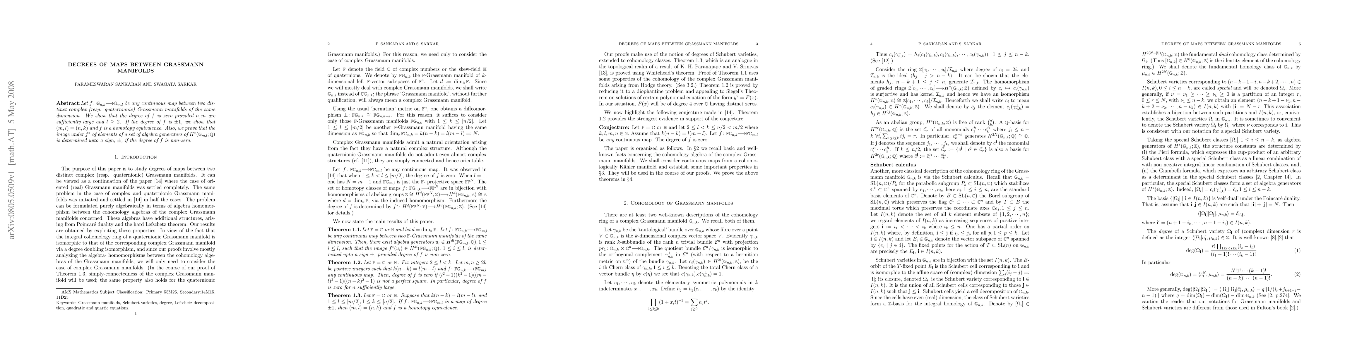 Let $f:G_{n,k}\longrightarrow G_{m,l}$ be any continuous map between any two distinct complex Grassmann manifolds of the same dimension where the target is not the complex projective space. We show that, for any given $k,l$, the degree of $f$ is zero provided that $m,n$ are sufficiently large. If the degree of $f$ is $\pm 1$, we show that $(m,l)=(n,k)$ and $f$ is a homotopy equivalence. Also, we prove that the image under $f^*$ of elements of a set of algebra generators of $H^*(G_{m,l};\mathbb{Q})$ is determined upto a sign, $\pm$, if the degree of $f$ is non-zero. Our proofs cover the case of quaternionic Grassmann manifolds as well.