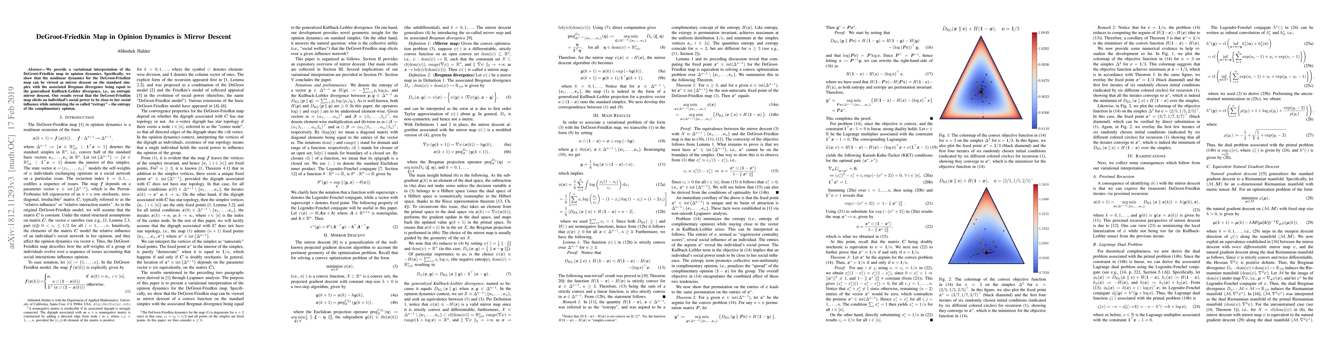 This paper interprets the DeGroot-Friedkin map in opinion dynamics as a form of mirror descent, specifically entropic mirror descent, on the standard simplex using the generalized Kullback-Leibler divergence. It demonstrates that the map minimizes "extropy," reflecting individuals' social influence while maintaining social power.