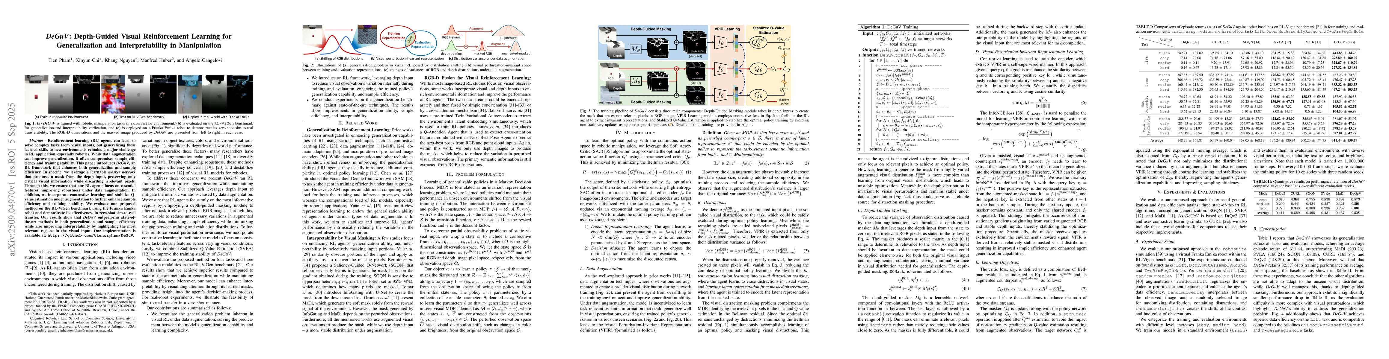 Reinforcement learning (RL) agents can learn to solve complex tasks from visual inputs, but generalizing these learned skills to new environments remains a major challenge in RL application, especially robotics. While data augmentation can improve generalization, it often compromises sample efficiency and training stability. This paper introduces DeGuV, an RL framework that enhances both generalization and sample efficiency. In specific, we leverage a learnable masker network that produces a mask from the depth input, preserving only critical visual information while discarding irrelevant pixels. Through this, we ensure that our RL agents focus on essential features, improving robustness under data augmentation. In addition, we incorporate contrastive learning and stabilize Q-value estimation under augmentation to further enhance sample efficiency and training stability. We evaluate our proposed method on the RL-ViGen benchmark using the Franka Emika robot and demonstrate its effectiveness in zero-shot sim-to-real transfer. Our results show that DeGuV outperforms state-of-the-art methods in both generalization and sample efficiency while also improving interpretability by highlighting the most relevant regions in the visual input
