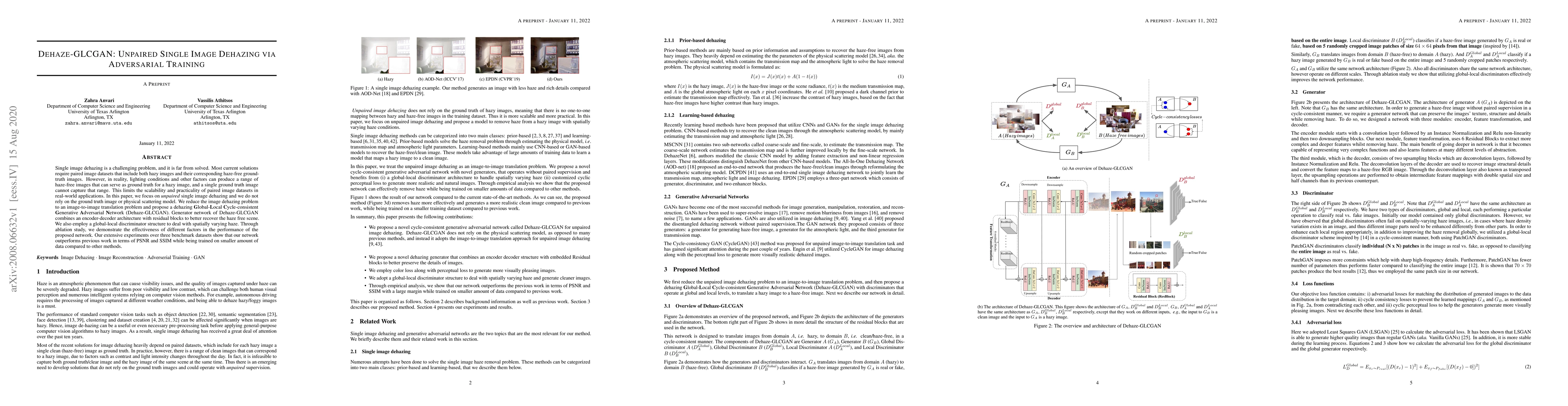 This paper proposes Dehaze-GLCGAN, an unpaired single image de-hazing method that leverages an encoder-decoder network with residual blocks and a global-local discriminator to handle spatially varying haze, achieving superior performance on benchmark datasets compared to previous methods.