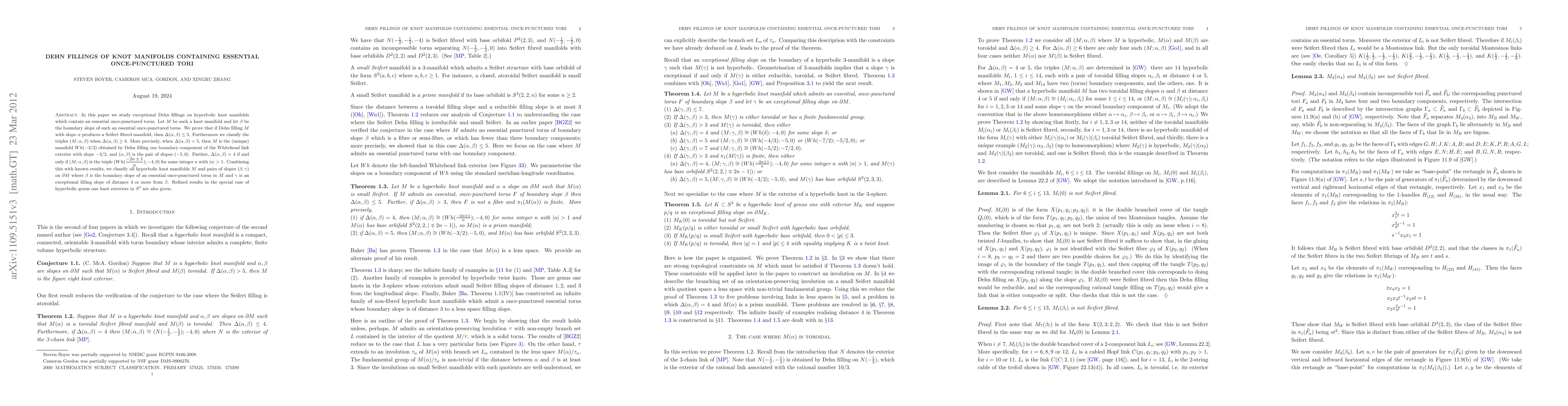 This paper investigates exceptional Dehn fillings on hyperbolic knot manifolds containing an essential once-punctured torus, proving that if filling produces a Seifert fibred manifold, the distance between filling slopes is at most 5. It classifies triples where the distance is 4 or 5, particularly identifying the unique manifold $Wh(-3/2)$ and specific triples $(Wh(\frac{-2n\pm1}{n}); -4, 0)$.