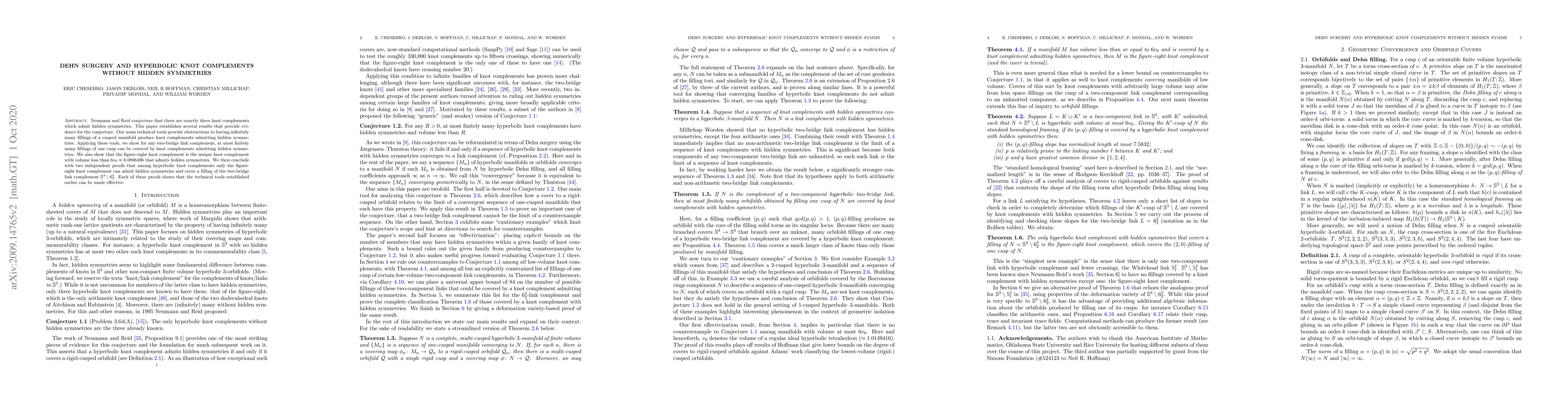 Neumann and Reid conjecture that there are exactly three knot complements which admit hidden symmetries. This paper establishes several results that provide evidence for the conjecture. Our main technical tools provide obstructions to having infinitely many fillings of a cusped manifold produce knot complements admitting hidden symmetries. Applying these tools, we show for any two-bridge link complement, at most finitely many fillings of one cusp can be covered by knot complements admitting hidden symmetries. We also show that the figure-eight knot complement is the unique knot complement with volume less than $6v_0 \approx 6.0896496$ that admits hidden symmetries. We then conclude with two independent proofs that among hyperbolic knot complements only the figure-eight knot complement can admit hidden symmetries and cover a filling of the two-bridge link complement $\mathbb{S}^3\setminus 6^2_2$. Each of these proofs shows that the technical tools established earlier can be made effective.