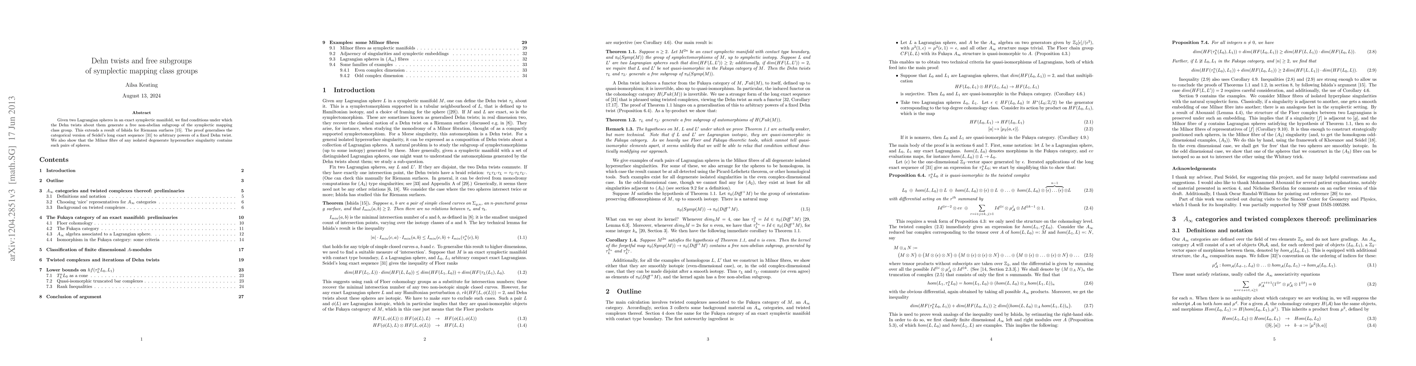 This paper investigates conditions for Dehn twists around Lagrangian spheres in symplectic manifolds to generate free non-abelian subgroups in the symplectic mapping class group, extending Ishida's result for Riemann surfaces, and utilizes a generalized categorical version of Seidel's long exact sequence. It also demonstrates the presence of such pairs of spheres in the Milnor fibre of hypersurface singularities.