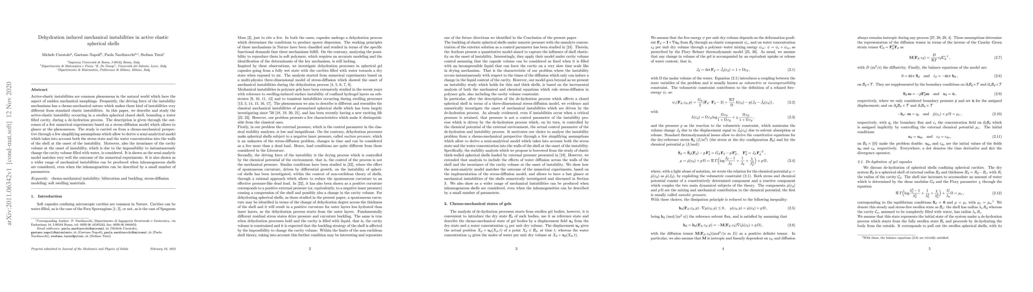 Active-elastic instabilities are common phenomena in the natural world which have the aspect of sudden mechanical morphings. Frequently, the driving force of the instability mechanisms has a chemo-mechanical nature which makes these kind of instabilities very different from standard elastic instabilities. In this paper, we describe and study the active-elastic instability occurring in a swollen spherical closed shell, bounding a water filled cavity, during a de-hydration process. The description is given through the outcomes of a few numerical experiments based on a stress-diffusion model which allows to glance at the phenomenon. The study is carried on from a chemo-mechanical perspective through a few simplifying assumptions which allow to derive a semi-analytical model which takes into account both the stress state and the water concentration into the walls of the shell at the onset of the instability. Moreover, also the invariance of the cavity volume at the onset of instability, which is due to the impossibility to instantaneously change the cavity volume filled with water, is considered. It is shown as the semi-analytic model matches very well the outcome of the numerical experiments. It is also shown as a wider range of mechanical instabilities can be produced when inhomogeneous shells are considered, even when the inhomogeneities can be described by a small number of parameters.