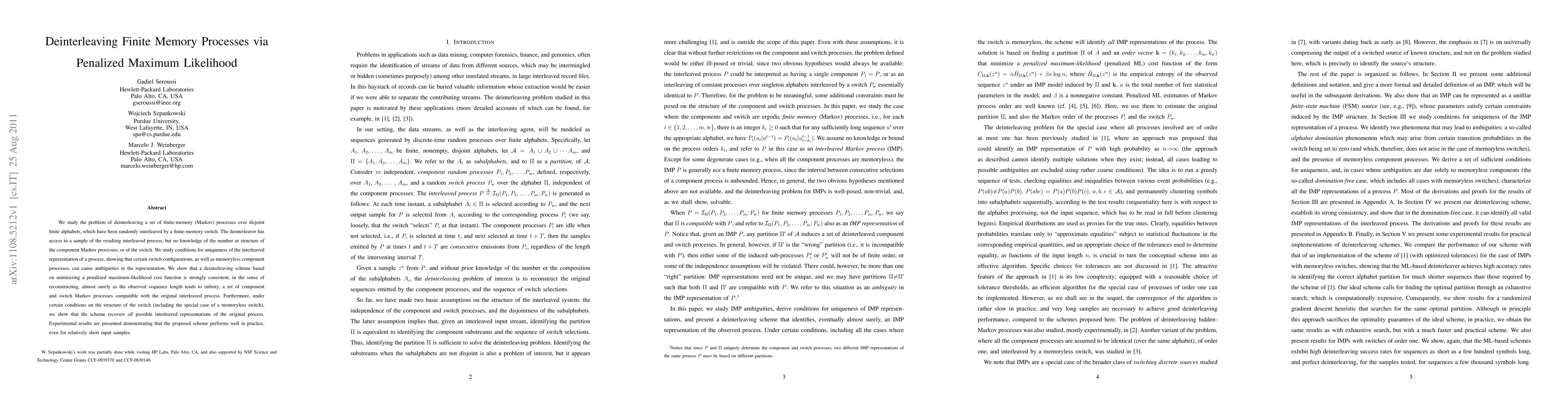 We study the problem of deinterleaving a set of finite-memory (Markov) processes over disjoint finite alphabets, which have been randomly interleaved by a finite-memory switch. The deinterleaver has access to a sample of the resulting interleaved process, but no knowledge of the number or structure of the component Markov processes, or of the switch. We study conditions for uniqueness of the interleaved representation of a process, showing that certain switch configurations, as well as memoryless component processes, can cause ambiguities in the representation. We show that a deinterleaving scheme based on minimizing a penalized maximum-likelihood cost function is strongly consistent, in the sense of reconstructing, almost surely as the observed sequence length tends to infinity, a set of component and switch Markov processes compatible with the original interleaved process. Furthermore, under certain conditions on the structure of the switch (including the special case of a memoryless switch), we show that the scheme recovers \emph{all} possible interleaved representations of the original process. Experimental results are presented demonstrating that the proposed scheme performs well in practice, even for relatively short input samples.