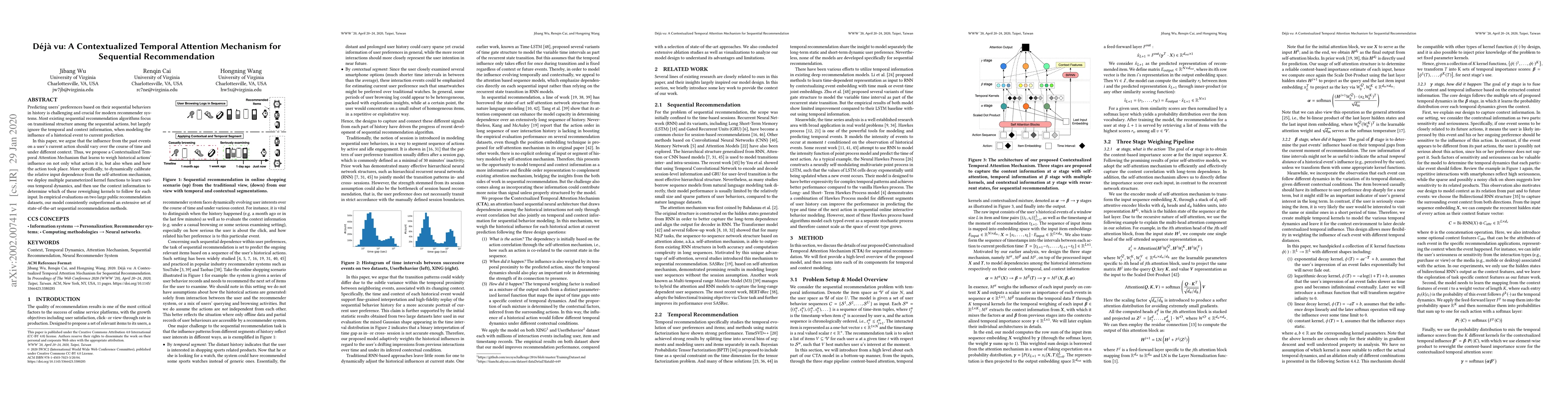 This paper proposes a Contextualized Temporal Attention Mechanism for sequential recommendation, emphasizing the varying influence of past events on current user actions based on time and context. The model uses multiple kernel functions to capture temporal dynamics and context information to dynamically calibrate input dependence, outperforming state-of-the-art methods in evaluations.