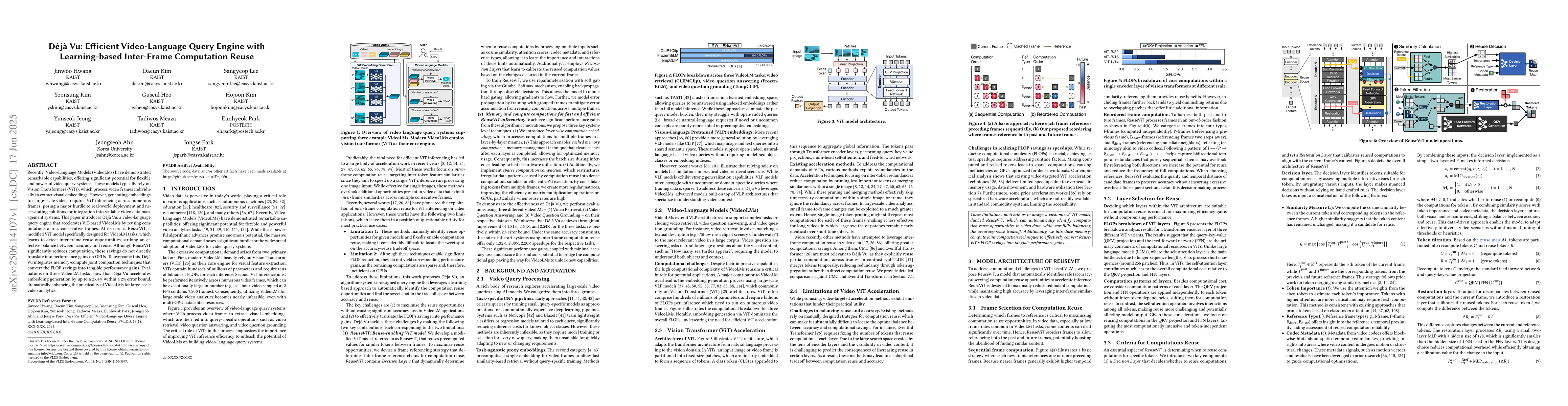 Recently, Video-Language Models (VideoLMs) have demonstrated remarkable capabilities, offering significant potential for flexible and powerful video query systems. These models typically rely on Vision Transformers (ViTs), which process video frames individually to extract visual embeddings. However, generating embeddings for large-scale videos requires ViT inferencing across numerous frames, posing a major hurdle to real-world deployment and necessitating solutions for integration into scalable video data management systems. This paper introduces D\'ej\`a Vu, a video-language query engine that accelerates ViT-based VideoLMs by reusing computations across consecutive frames. At its core is ReuseViT, a modified ViT model specifically designed for VideoLM tasks, which learns to detect inter-frame reuse opportunities, striking an effective balance between accuracy and reuse. Although ReuseViT significantly reduces computation, these savings do not directly translate into performance gains on GPUs. To overcome this, D\'ej\`a Vu integrates memory-compute joint compaction techniques that convert the FLOP savings into tangible performance gains. Evaluations on three VideoLM tasks show that D\'ej\`a Vu accelerates embedding generation by up to a 2.64x within a 2% error bound, dramatically enhancing the practicality of VideoLMs for large-scale video analytics.