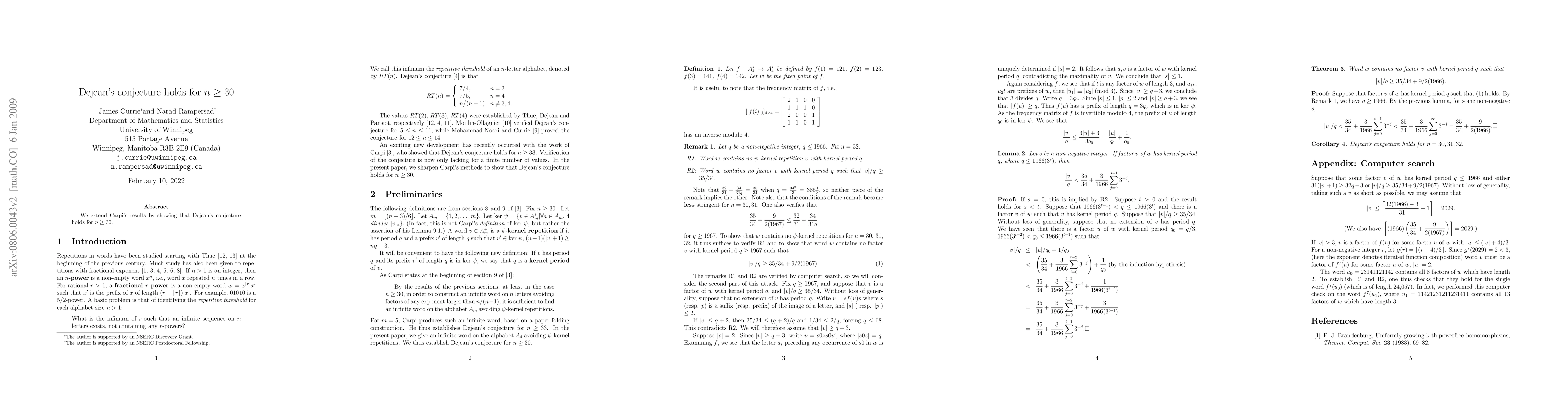 We extend Carpi's results by showing that Dejean's conjecture holds for n >= 30.