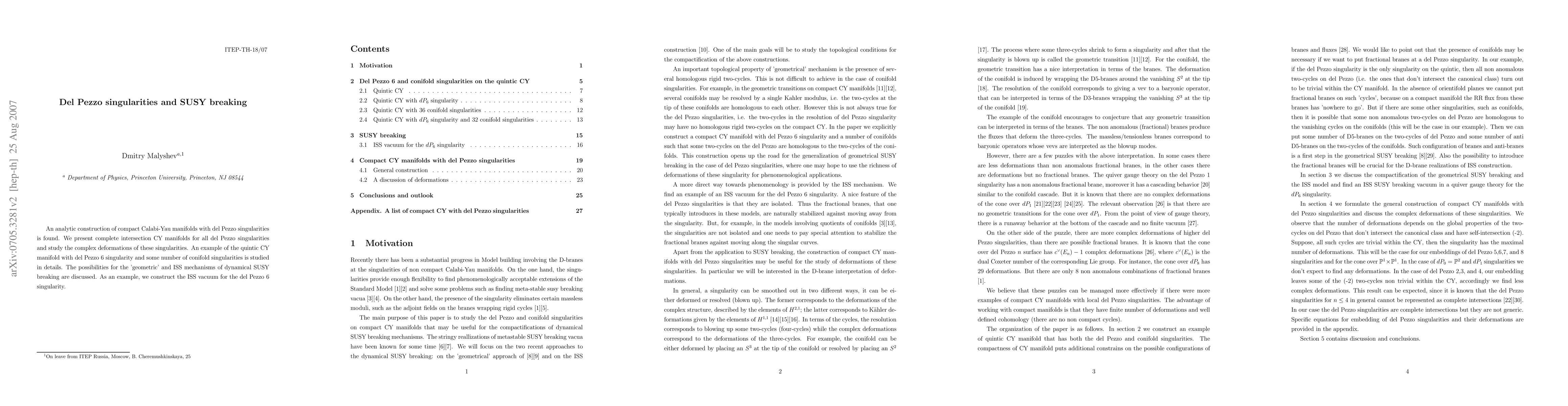 Researchers construct compact Calabi-Yau manifolds with del Pezzo singularities, studying their complex deformations and implications for dynamical SUSY breaking mechanisms.
