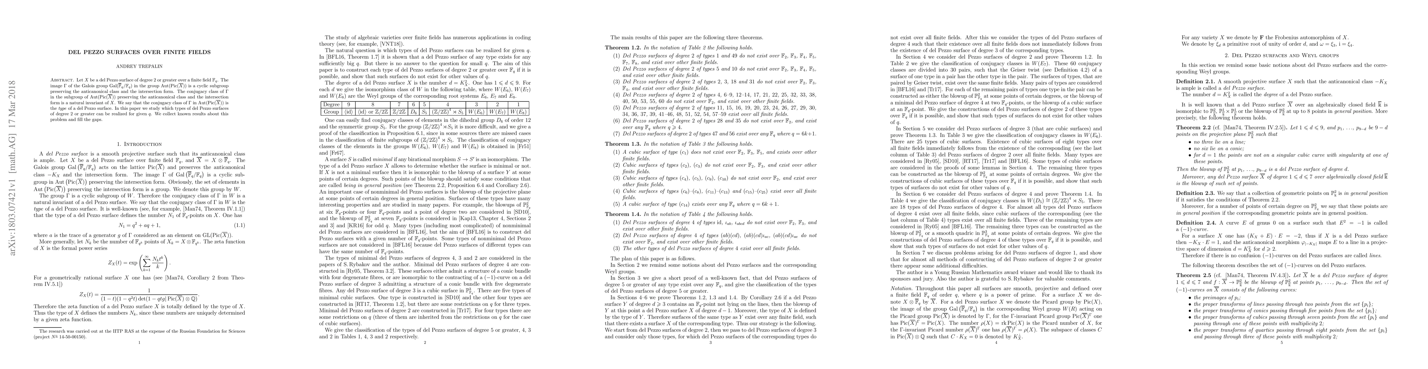 This paper studies del Pezzo surfaces over finite fields, focusing on which types can be realized for given field sizes. It collects known results and fills gaps in the understanding of these surfaces' types.