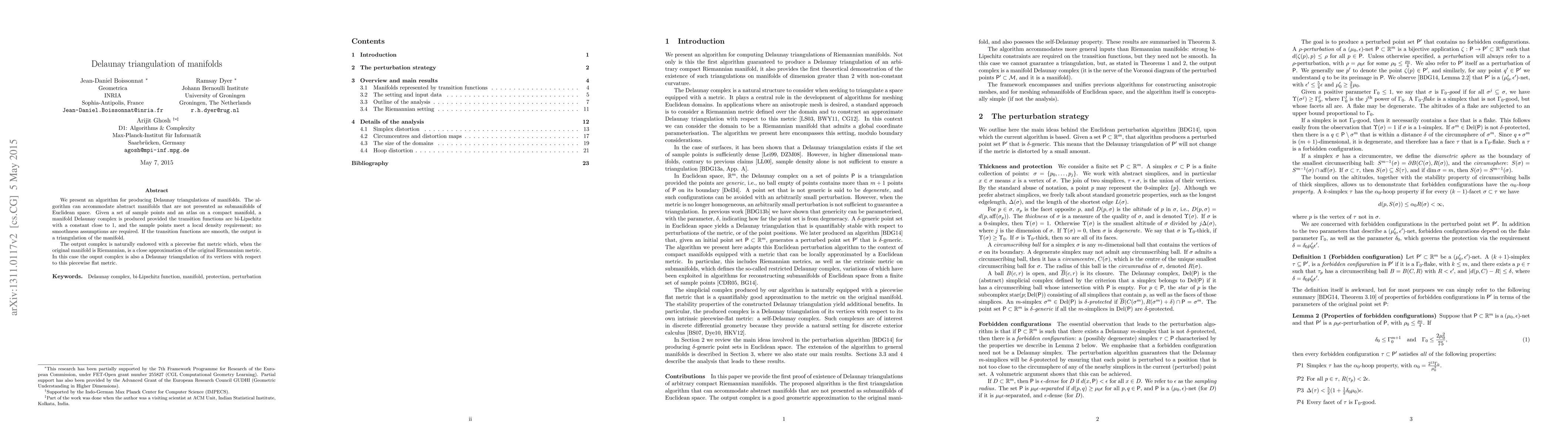 The paper presents an algorithm for generating Delaunay triangulations of abstract manifolds using an atlas and sample points, with no smoothness assumptions required.