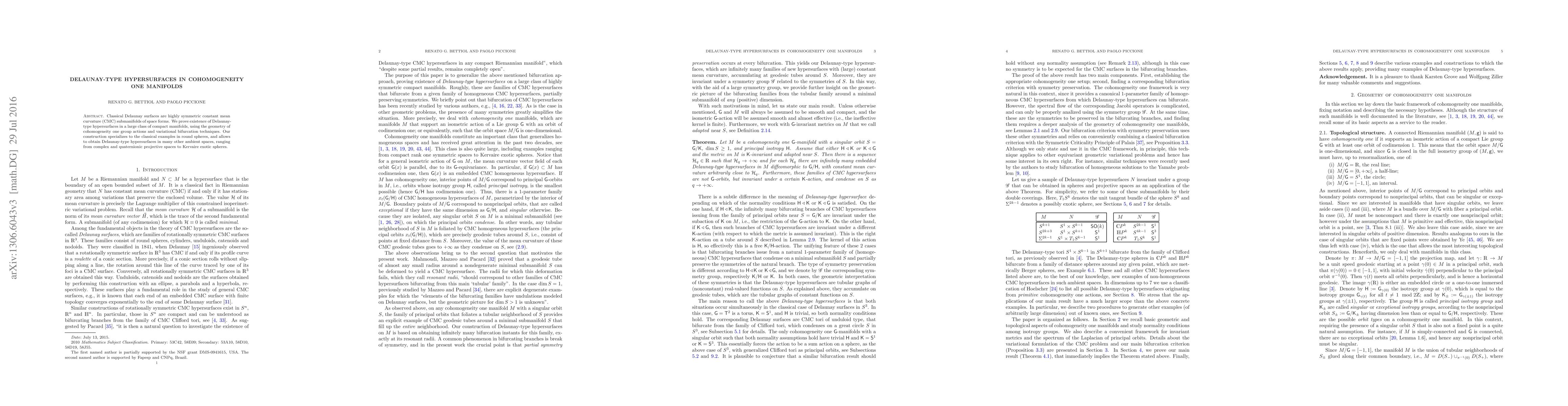 This paper proves the existence of Delaunay-type hypersurfaces in compact cohomogeneity one manifolds via geometric analysis and variational bifurcation techniques, extending classical examples to a wide range of ambient spaces including complex and quaternionic projective spaces and Kervaire exotic spheres.