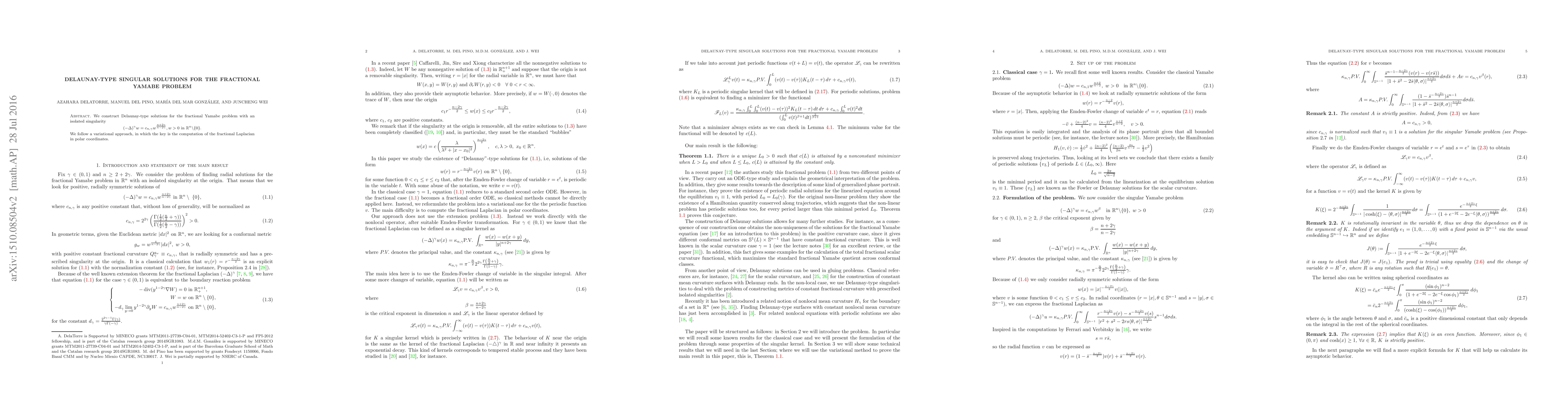 This paper constructs Delaunay-type singular solutions for the fractional Yamabe problem using a variational approach, focusing on the computation of the fractional Laplacian in polar coordinates to handle the isolated singularity.