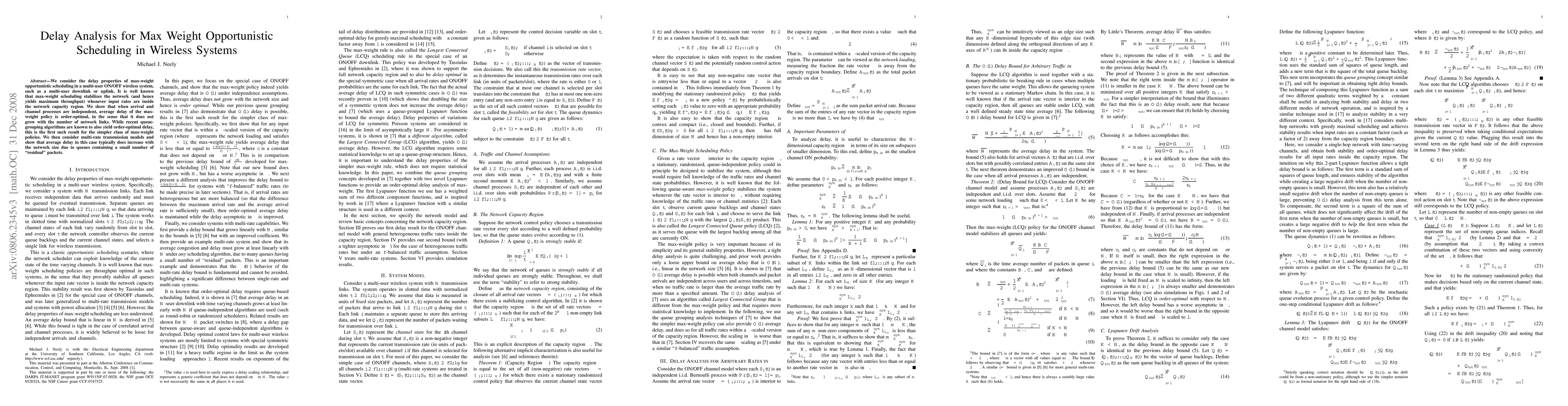 This paper analyzes the delay properties of max-weight opportunistic scheduling in multi-user wireless systems. It finds that the average delay of max-weight policies is order-optimal in terms of network links, unlike multi-rate models where delay increases with network size due to residual packets.