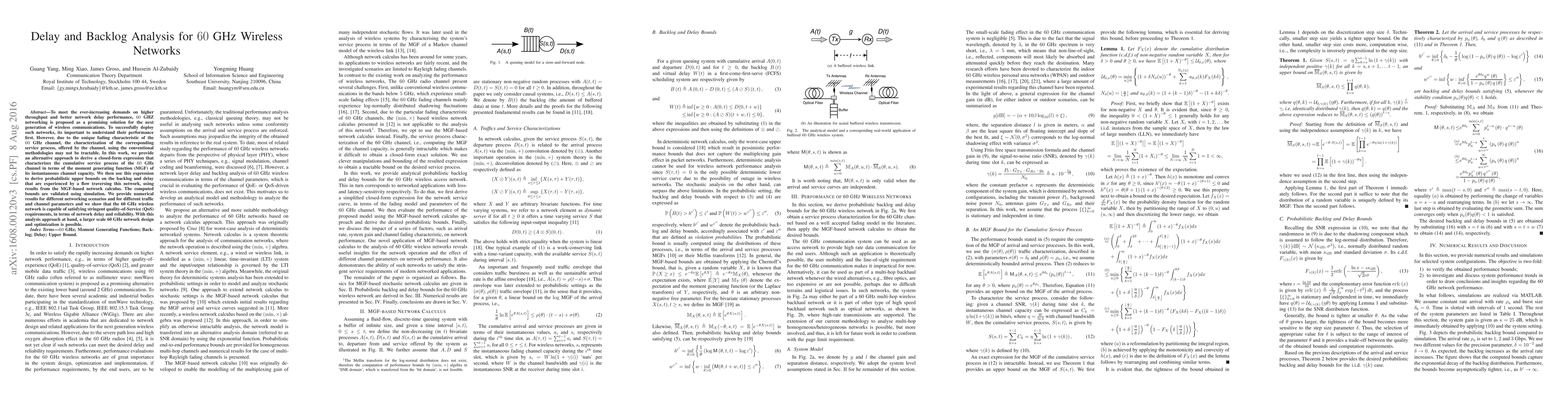 This paper proposes a novel method to analyze delay and backlog in 60 GHz wireless networks, deriving a closed-form expression for the cumulative service process using the moment generating function. The derived bounds on network delay and backlog are validated through simulations, demonstrating the capability of 60 GHz networks to meet stringent QoS requirements.