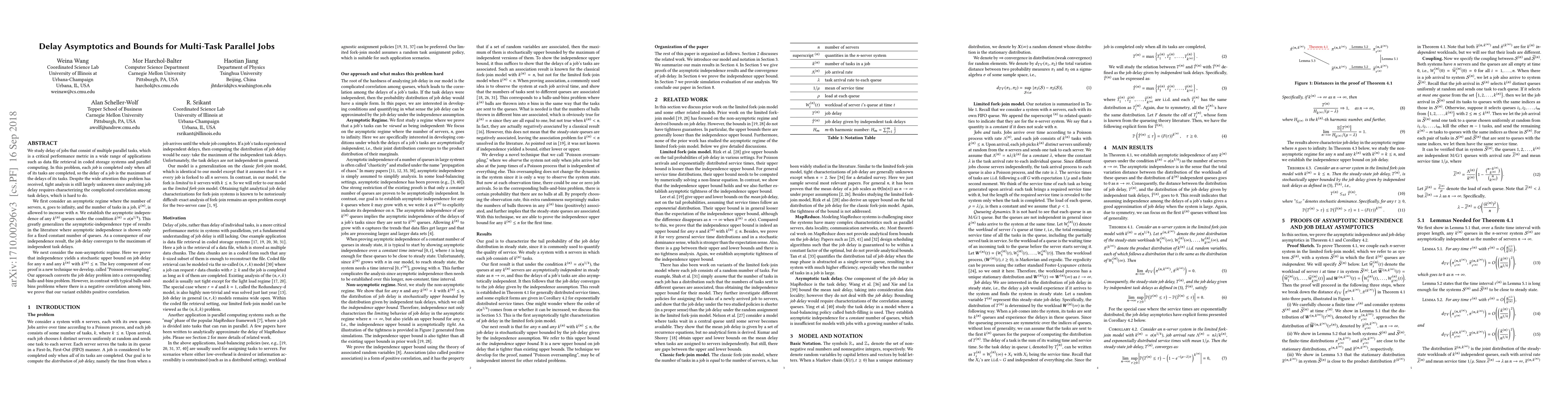 This paper investigates the delay of multi-task parallel jobs, establishing asymptotic independence among task delays under certain conditions. It demonstrates that job delay converges to the maximum of independent task delays in an asymptotic regime where the number of servers is infinite. In the non-asymptotic regime, the authors develop a novel "Poisson oversampling" technique to derive a stochastic upper bound on job delay, revealing a positive correlation in their variant of the balls-and-bins problem.