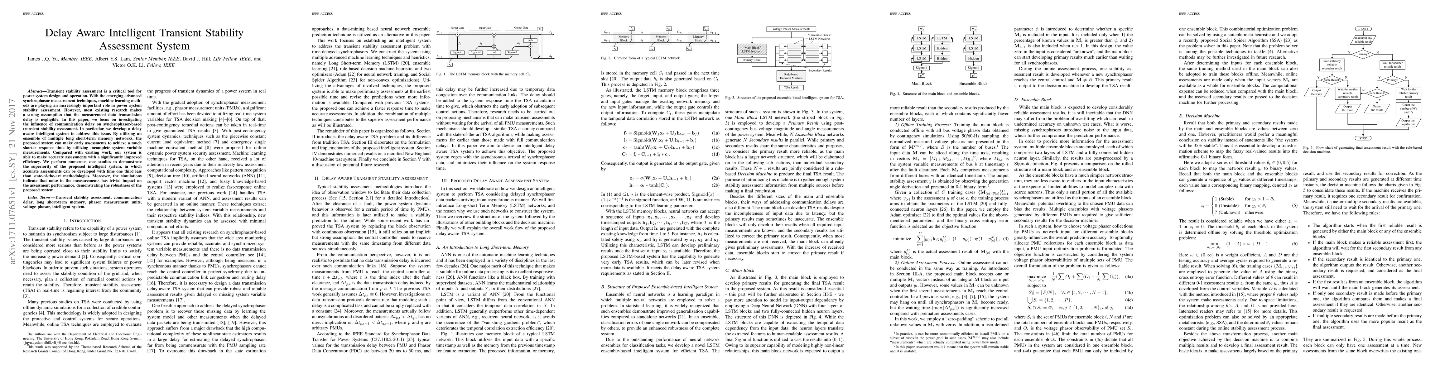 This paper proposes a delay aware intelligent transient stability assessment system using an ensemble of long short-term memory networks to handle communication delays in synchrophasor data. The system achieves early and accurate assessments with significantly improved efficiency compared to existing methods.