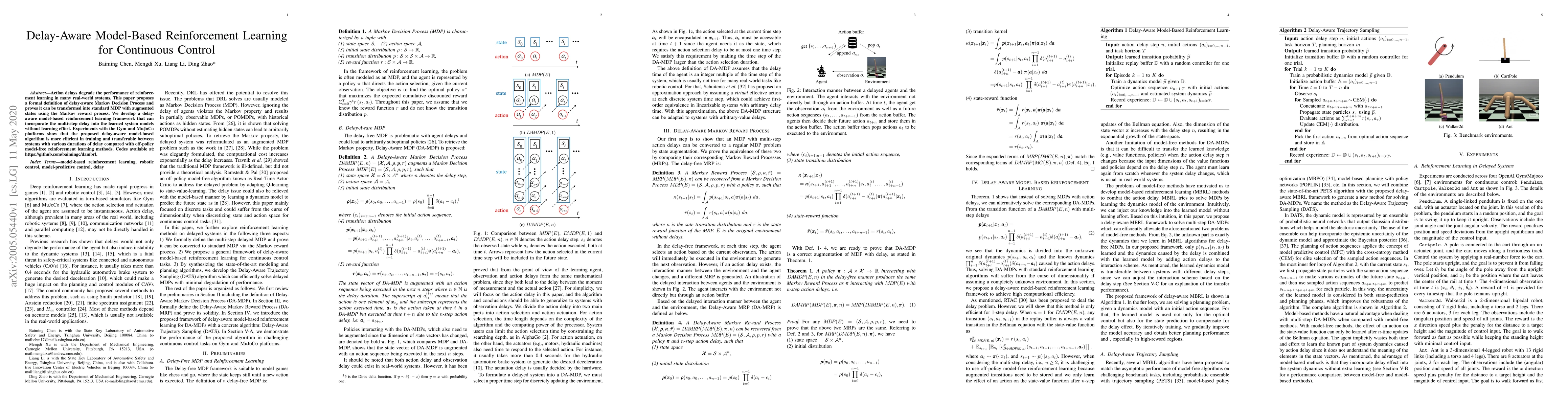 Action delays degrade the performance of reinforcement learning in many real-world systems. This paper proposes a formal definition of delay-aware Markov Decision Process and proves it can be transformed into standard MDP with augmented states using the Markov reward process. We develop a delay-aware model-based reinforcement learning framework that can incorporate the multi-step delay into the learned system models without learning effort. Experiments with the Gym and MuJoCo platforms show that the proposed delay-aware model-based algorithm is more efficient in training and transferable between systems with various durations of delay compared with off-policy model-free reinforcement learning methods. Codes available at: https://github.com/baimingc/dambrl.
