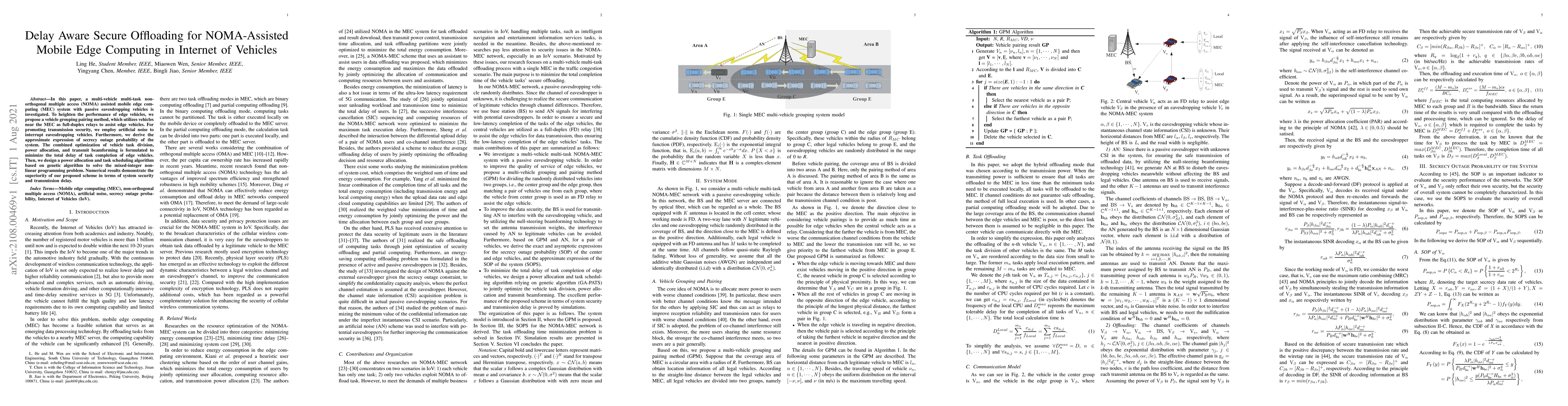 In this paper, a multi-vehicle multi-task nonorthogonal multiple access (NOMA) assisted mobile edge computing (MEC) system with passive eavesdropping vehicles is investigated. To heighten the performance of edge vehicles, we propose a vehicle grouping pairing method, which utilizes vehicles near the MEC as full-duplex relays to assist edge vehicles. For promoting transmission security, we employ artificial noise to interrupt eavesdropping vehicles. Furthermore, we derive the approximate expression of secrecy outage probability of the system. The combined optimization of vehicle task division, power allocation, and transmit beamforming is formulated to minimize the total delay of task completion of edge vehicles. Then, we design a power allocation and task scheduling algorithm based on genetic algorithm to solve the mixed-integer nonlinear programming problem. Numerical results demonstrate the superiority of our proposed scheme in terms of system security and transmission delay.