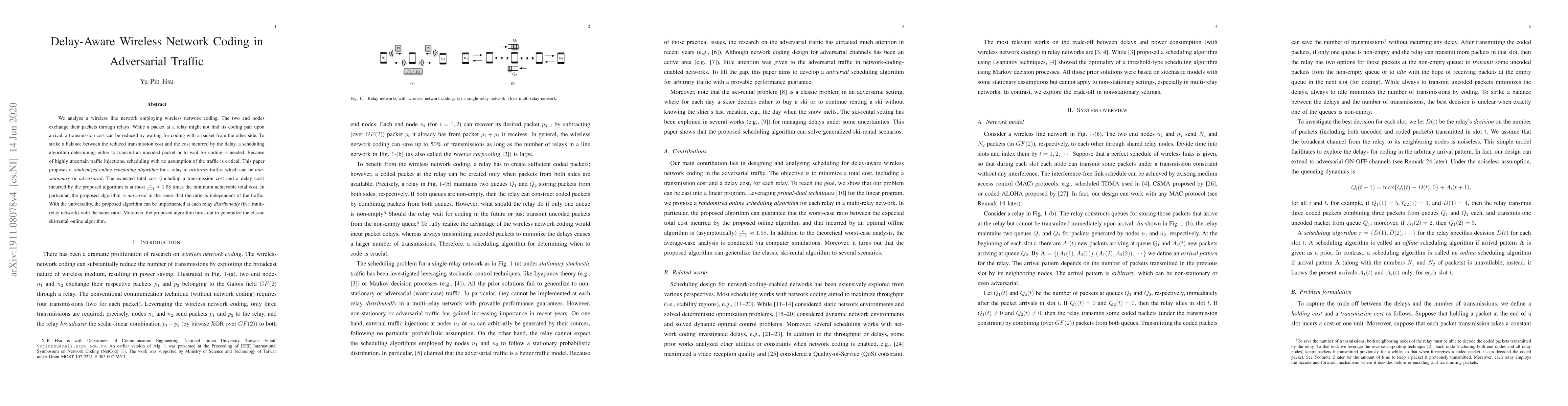 We analyze a wireless line network employing wireless network coding. The two end nodes exchange their packets through relays. While a packet at a relay might not find its coding pair upon arrival, a transmission cost can be reduced by waiting for coding with a packet from the other side. To strike a balance between the reduced transmission cost and the cost incurred by the delay, a scheduling algorithm determining either to transmit an uncoded packet or to wait for coding is needed. Because of highly uncertain traffic injections, scheduling with no assumption of the traffic is critical. This paper proposes a randomized online scheduling algorithm for a relay in arbitrary traffic, which can be non-stationary or adversarial. The expected total cost (including a transmission cost and a delay cost) incurred by the proposed algorithm is at most e/(e-1) ~ 1.58 times the minimum achievable total cost. In particular, the proposed algorithm is universal in the sense that the ratio is independent of the traffic. With the universality, the proposed algorithm can be implemented at each relay distributedly (in a multi-relay network) with the same ratio. Moreover, the proposed algorithm turns out to generalize the classic ski-rental online algorithm.