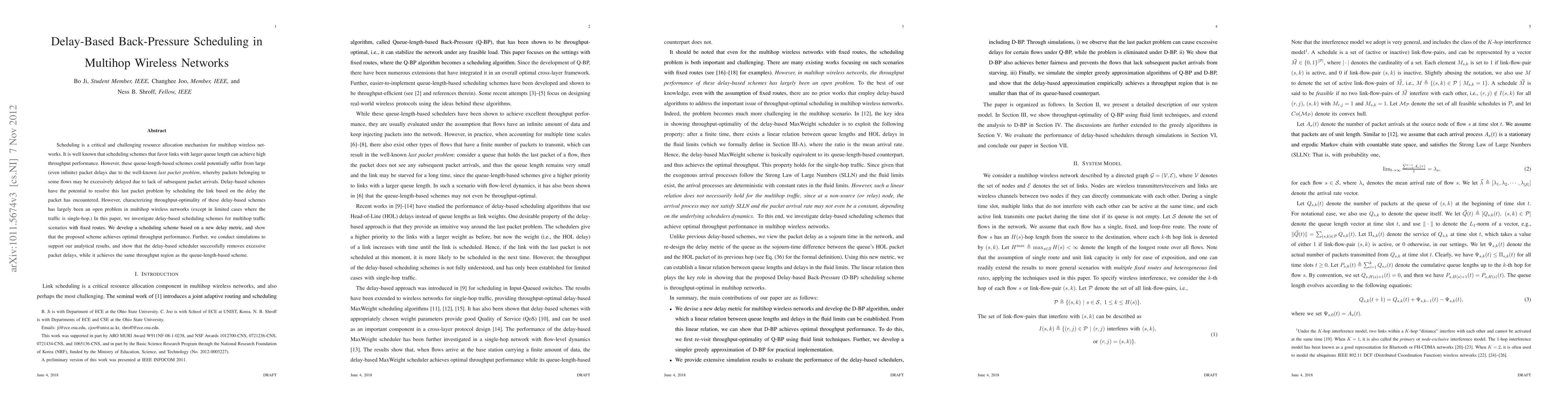 This paper proposes a delay-based back-pressure scheduling scheme for multihop wireless networks, demonstrating optimal throughput performance and resolving the last packet problem by prioritizing links based on packet delay rather than queue length. Simulation results confirm the scheme's effectiveness in eliminating excessive delays.