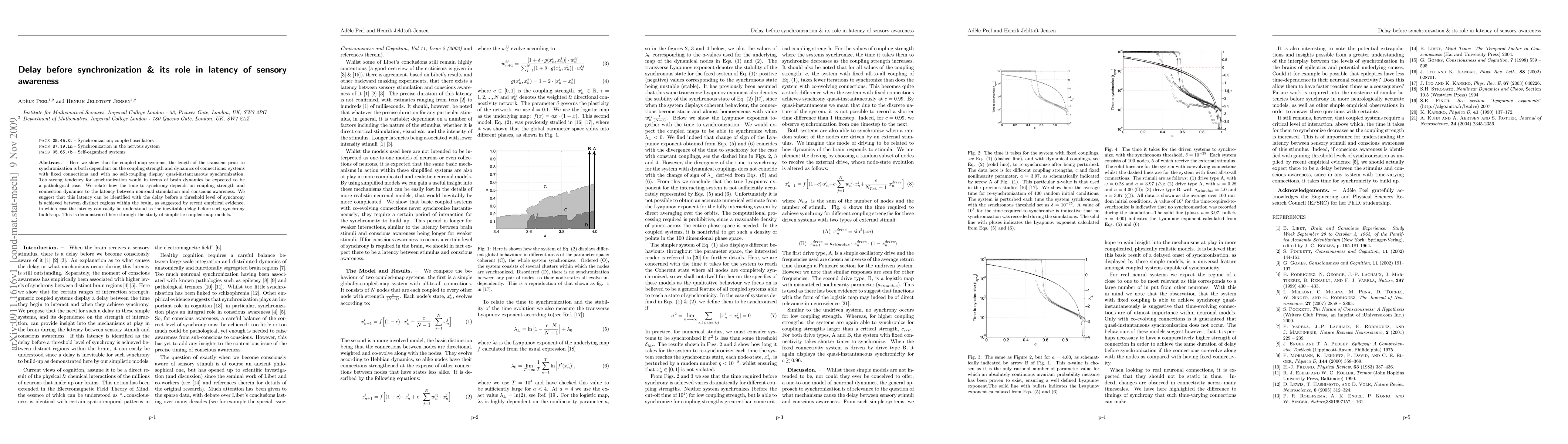 This paper investigates the delay before synchronization in coupled-map systems, showing that it depends on coupling strength and connection dynamics. It proposes that this delay correlates with the latency of sensory awareness, suggesting that conscious perception is linked to the time needed for sufficient synchrony among brain regions.