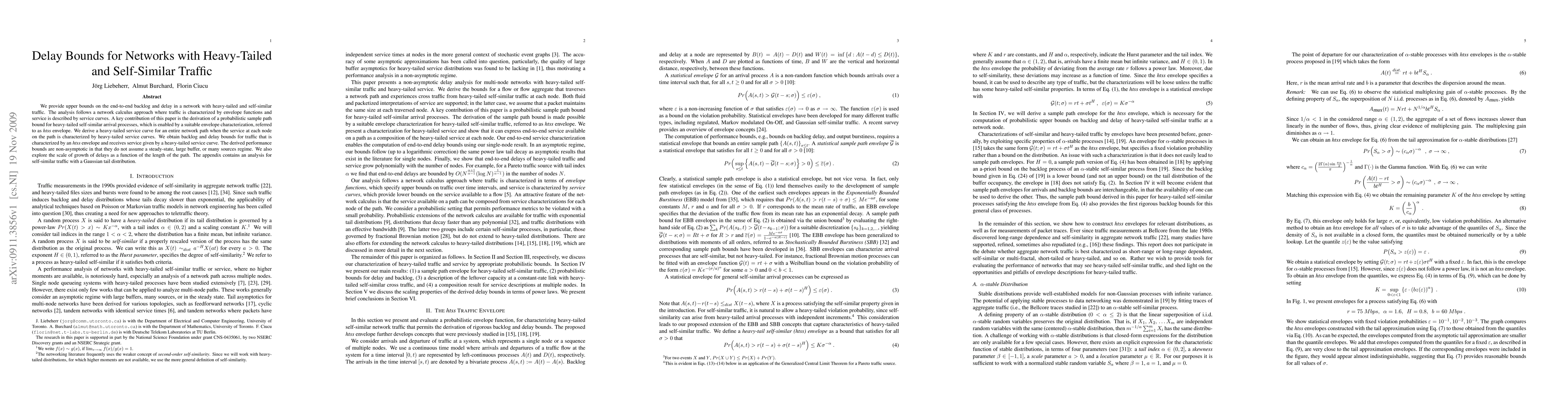 We provide upper bounds on the end-to-end backlog and delay in a network with heavy-tailed and self-similar traffic. The analysis follows a network calculus approach where traffic is characterized by envelope functions and service is described by service curves. A key contribution of this paper is the derivation of a probabilistic sample path bound for heavy-tailed self-similar arrival processes, which is enabled by a suitable envelope characterization, referred to as `htss envelope'. We derive a heavy-tailed service curve for an entire network path when the service at each node on the path is characterized by heavy-tailed service curves. We obtain backlog and delay bounds for traffic that is characterized by an htss envelope and receives service given by a heavy-tailed service curve. The derived performance bounds are non-asymptotic in that they do not assume a steady-state, large buffer, or many sources regime. We also explore the scale of growth of delays as a function of the length of the path. The appendix contains an analysis for self-similar traffic with a Gaussian tail distribution.