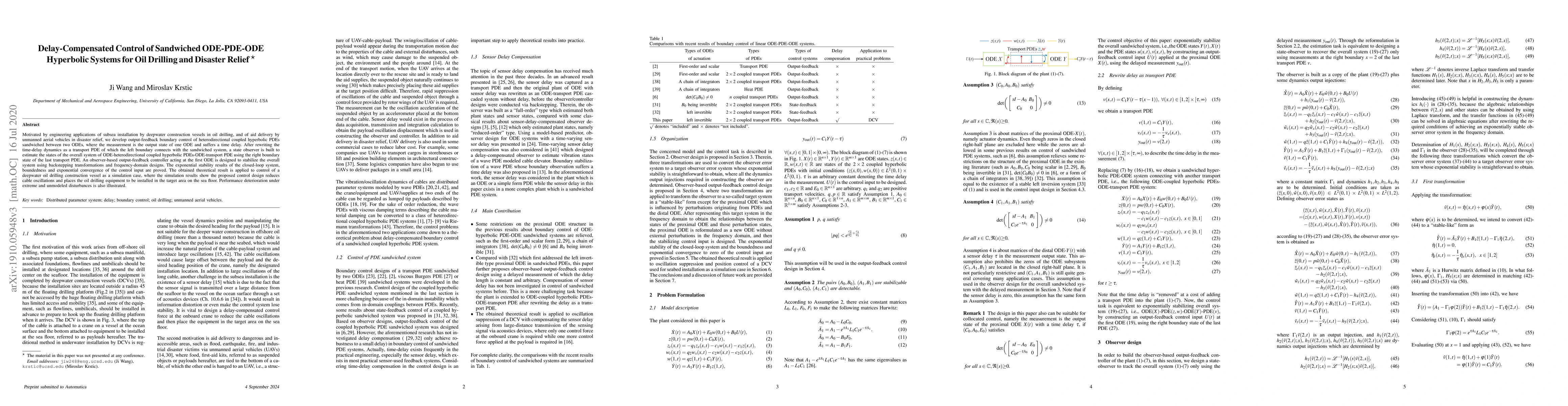 Motivated by engineering applications of subsea installation by deepwater construction vessels in oil drilling, and of aid delivery by unmanned aerial vehicles in disaster relief, we develop output-feedback boundary control of heterodirectional coupled hyperbolic PDEs sandwiched between two ODEs, where the measurement is the output state of one ODE and suffers a time delay. After rewriting the time-delay dynamics as a transport PDE of which the left boundary connects with the sandwiched system, a state observer is built to estimate the states of the overall system of ODE-heterodirectional coupled hyperbolic PDEs-ODE-transport PDE using the right boundary state of the last transport PDE. An observer-based output-feedback controller acting at the first ODE is designed to stabilize the overall system using backstepping transformations and frequency-domain designs. The exponential stability results of the closed-loop system, boundedness and exponential convergence of the control input are proved. The obtained theoretical result is applied to control of a deepwater oil drilling construction vessel as a simulation case, where the simulation results show the proposed control design reduces cable oscillations and places the oil drilling equipment to be installed in the target area on the sea floor. Performance deterioration under extreme and unmodeled disturbances is also illustrated.