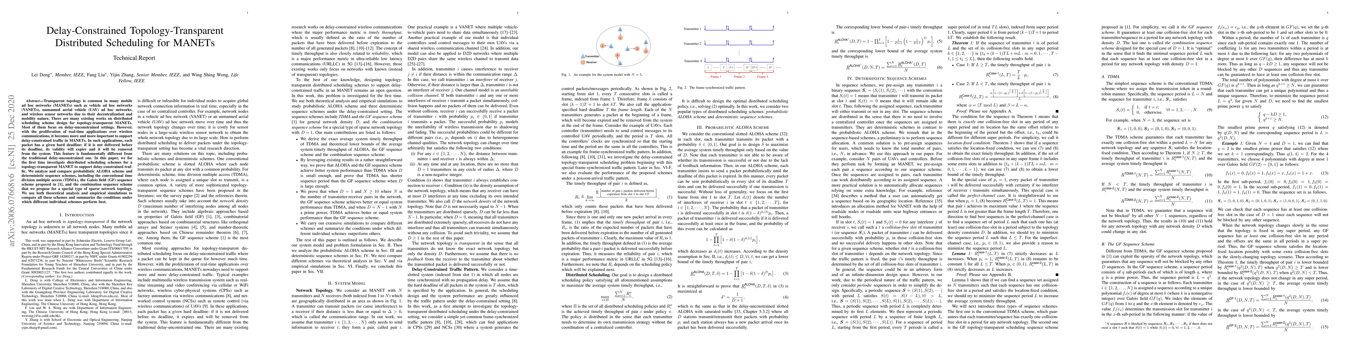 This paper investigates distributed scheduling schemes for topology-transparent MANETs to support delay-constrained traffic, analyzing probabilistic ALOHA and deterministic sequences like TDMA and GF. It proposes a combination sequence scheme for sparse networks and compares performance through theoretical analysis and simulations.