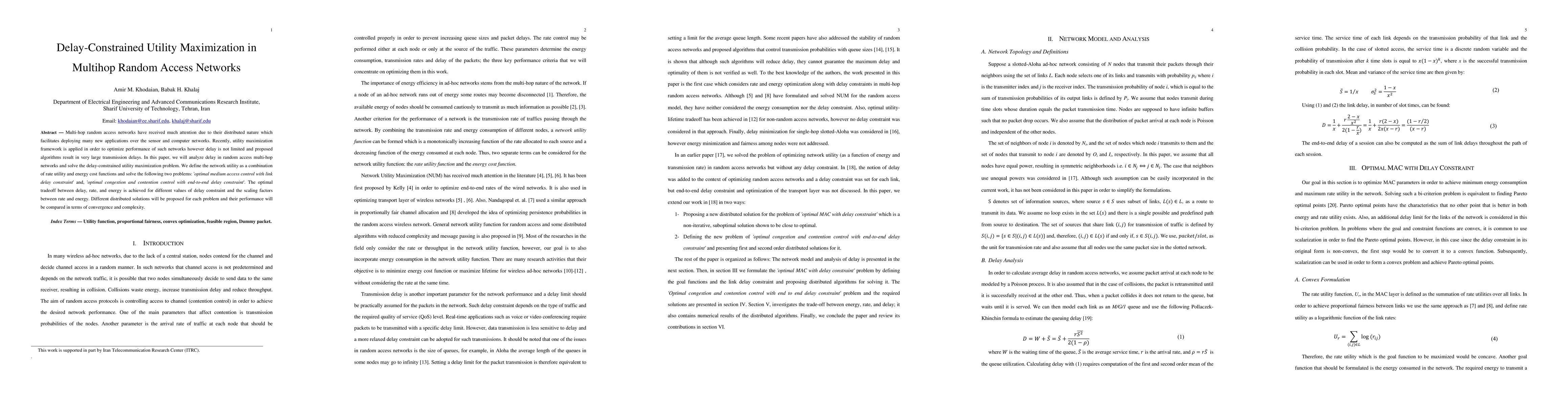 This paper addresses delay-constrained utility maximization in multi-hop random access networks, proposing distributed algorithms to optimize network performance under delay constraints. It defines network utility as a mix of rate utility and energy cost, solving for optimal medium access and congestion control while achieving a balance between delay, rate, and energy efficiency.