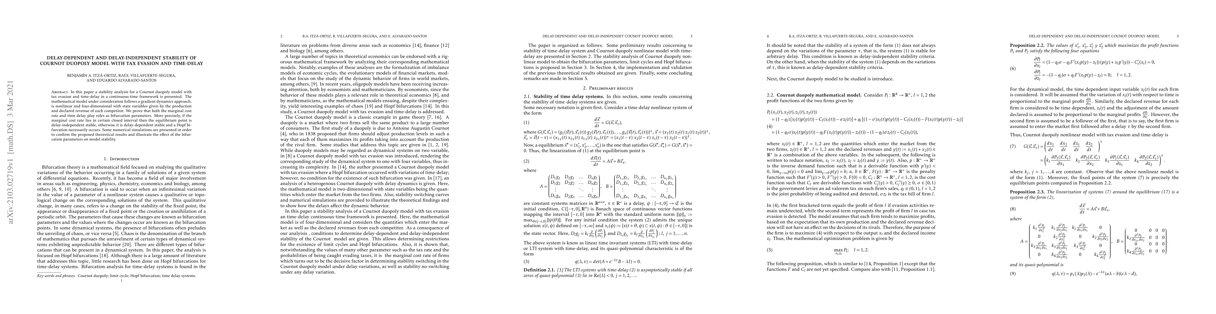 This paper analyzes the stability of a nonlinear Cournot duopoly model with tax evasion and time-delay, showing that marginal cost rate and time delay are bifurcation parameters. The model is stable under certain conditions, exhibiting delay-independent or delay-dependent stability, with numerical simulations confirming the theoretical results.