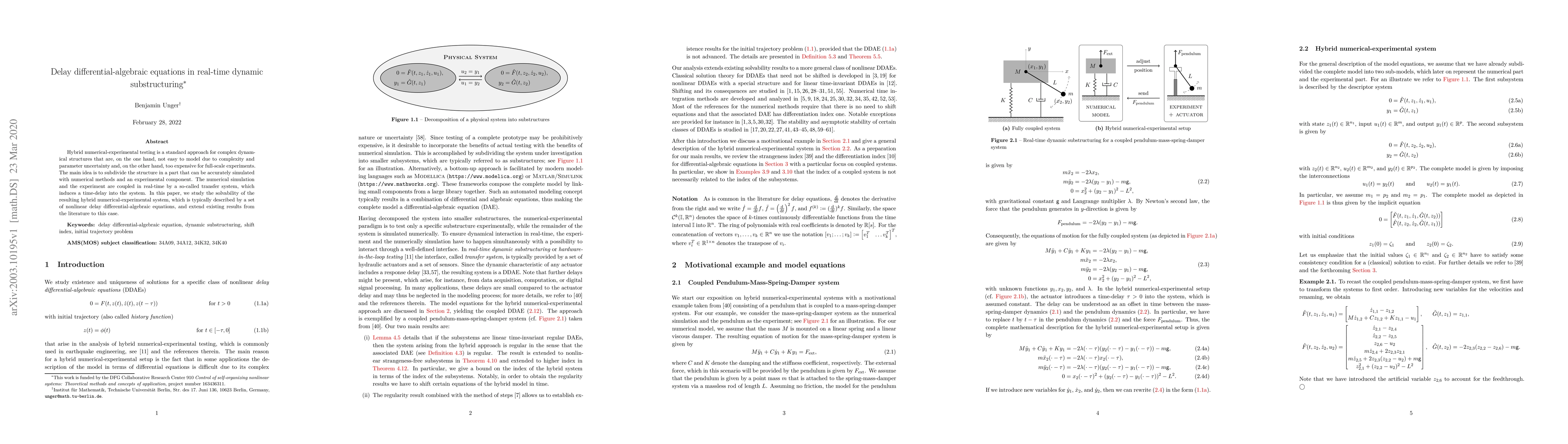 Hybrid numerical-experimental testing is a standard approach for complex dynamical structures that are, on the one hand, not easy to model due to complexity and parameter uncertainty and, on the other hand, too expensive for full-scale experiments. The main idea is to subdivide the structure in a part that can be accurately simulated with numerical methods and an experimental component. The numerical simulation and the experiment are coupled in real-time by a so-called transfer system, which induces a time-delay into the system. In this paper, we study the solvability of the resulting hybrid numerical-experimental system, which is typically described by a set of nonlinear delay differential-algebraic equations, and extend existing results from the literature to this case.