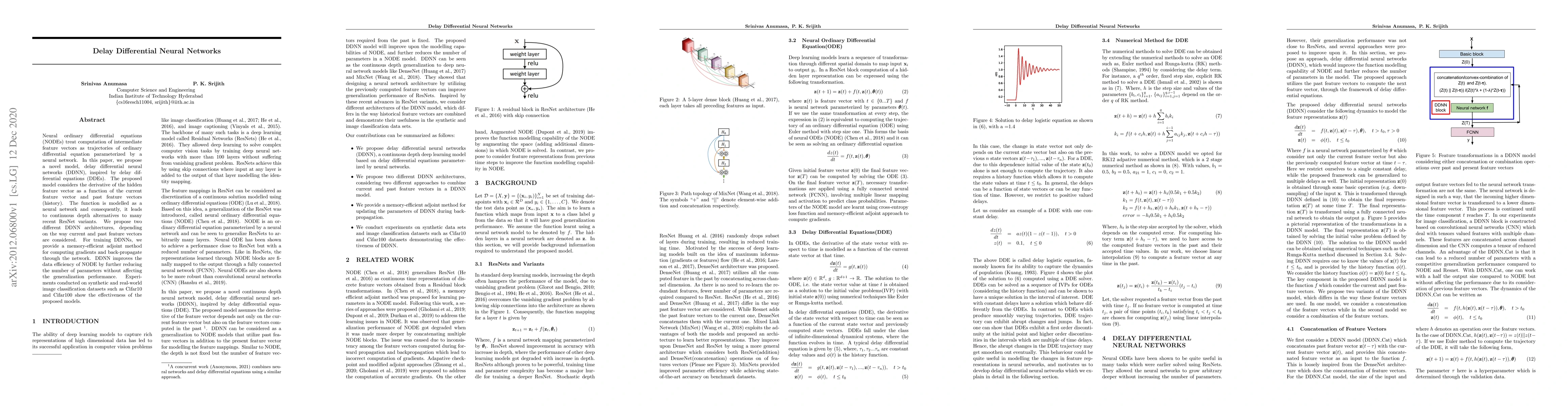 Neural ordinary differential equations (NODEs) treat computation of intermediate feature vectors as trajectories of ordinary differential equation parameterized by a neural network. In this paper, we propose a novel model, delay differential neural networks (DDNN), inspired by delay differential equations (DDEs). The proposed model considers the derivative of the hidden feature vector as a function of the current feature vector and past feature vectors (history). The function is modelled as a neural network and consequently, it leads to continuous depth alternatives to many recent ResNet variants. We propose two different DDNN architectures, depending on the way current and past feature vectors are considered. For training DDNNs, we provide a memory-efficient adjoint method for computing gradients and back-propagate through the network. DDNN improves the data efficiency of NODE by further reducing the number of parameters without affecting the generalization performance. Experiments conducted on synthetic and real-world image classification datasets such as Cifar10 and Cifar100 show the effectiveness of the proposed models.