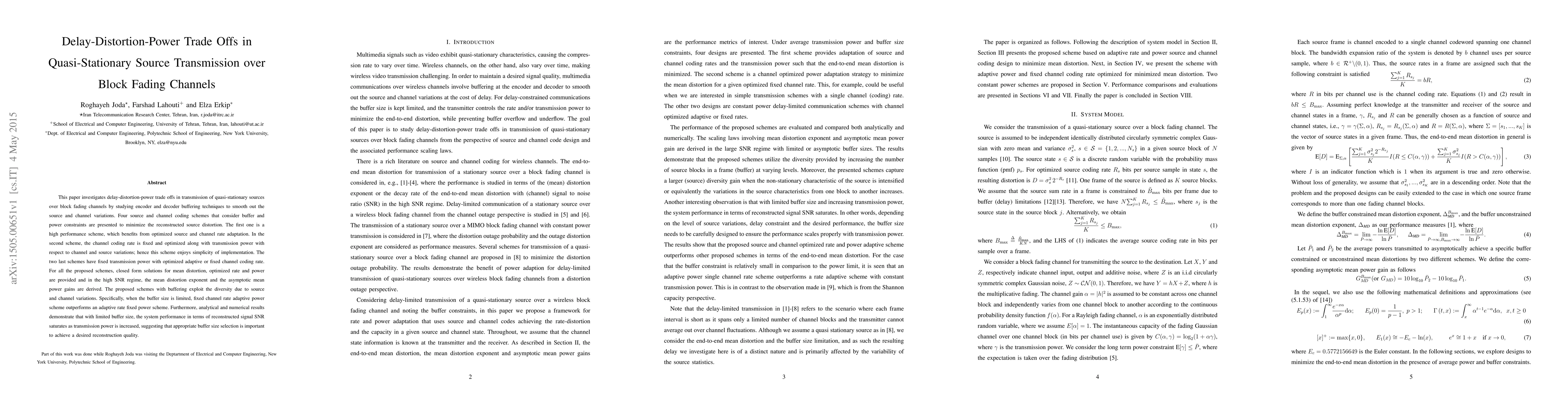 This paper explores delay-distortion-power trade-offs for quasi-stationary source transmission over block fading channels, proposing four coding schemes with buffering to minimize distortion. The schemes balance performance, simplicity, and power optimization, with analytical results highlighting the importance of buffer size for desired reconstruction quality.