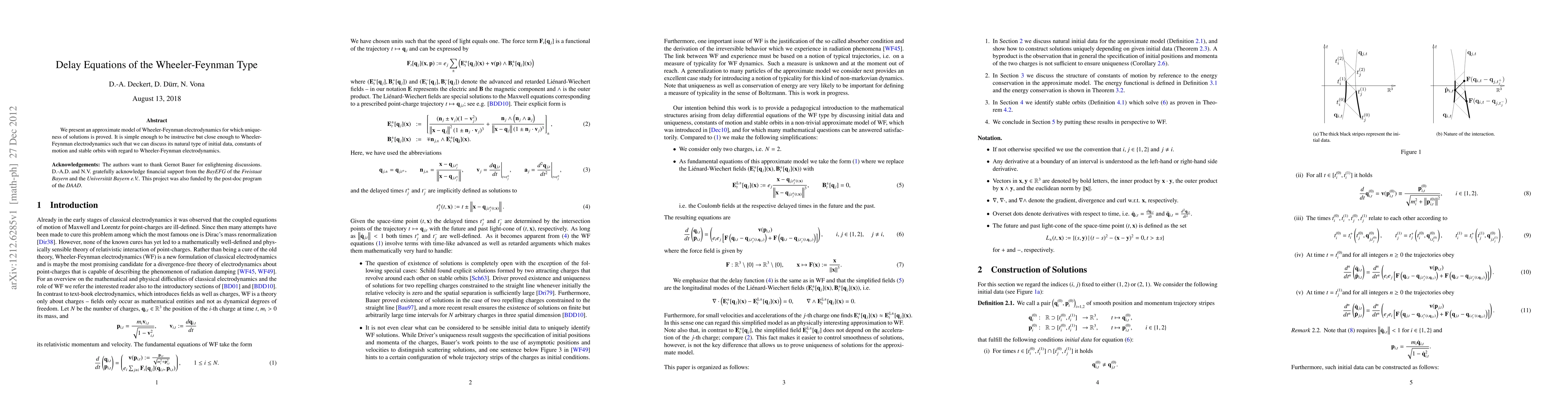 We present an approximate model of Wheeler-Feynman electrodynamics for which uniqueness of solutions is proved. It is simple enough to be instructive but close enough to Wheeler-Feynman electrodynamics such that we can discuss its natural type of initial data, constants of motion and stable orbits with regard to Wheeler-Feynman electrodynamics.