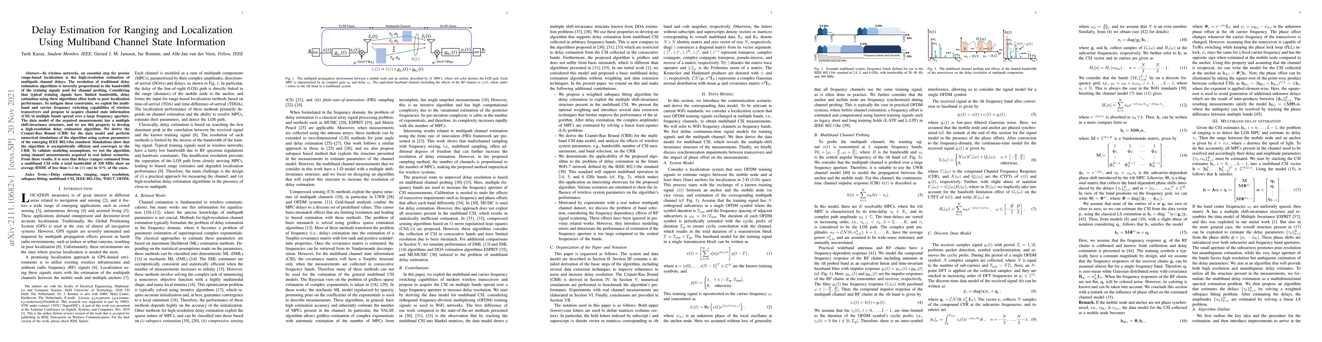 In wireless networks, an essential step for precise range-based localization is the high-resolution estimation of multipath channel delays. The resolution of traditional delay estimation algorithms is inversely proportional to the bandwidth of the training signals used for channel probing. Considering that typical training signals have limited bandwidth, delay estimation using these algorithms often leads to poor localization performance. To mitigate these constraints, we exploit the multiband and carrier frequency switching capabilities of wireless transceivers and propose to acquire channel state information (CSI) in multiple bands spread over a large frequency aperture. The data model of the acquired measurements has a multiple shift-invariance structure, and we use this property to develop a high-resolution delay estimation algorithm. We derive the Cram\'er-Rao Bound (CRB) for the data model and perform numerical simulations of the algorithm using system parameters of the emerging IEEE 802.11be standard. Simulations show that the algorithm is asymptotically efficient and converges to the CRB. To validate modeling assumptions, we test the algorithm using channel measurements acquired in real indoor scenarios. From these results, it is seen that delays (ranges) estimated from multiband CSI with a total bandwidth of 320 MHz show an average RMSE of less than 0.3 ns (10 cm) in 90% of the cases.