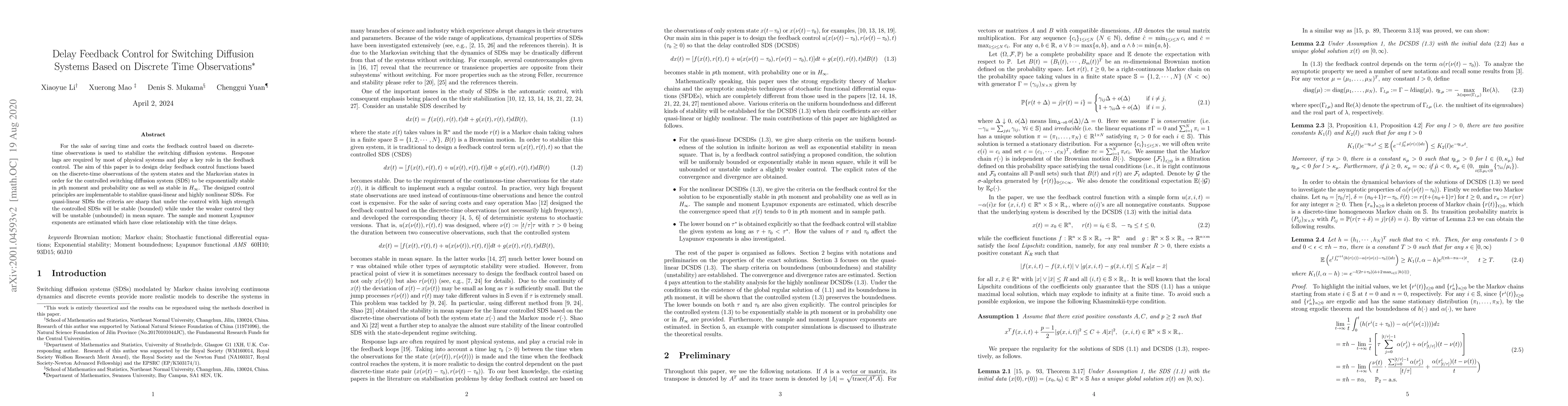 This paper proposes delay feedback control strategies for stabilizing switching diffusion systems using discrete-time observations. The designed control functions ensure exponential stability in $p$th moment and probability one, as well as $H_\infty$ stability, applicable to both quasi-linear and highly nonlinear systems.