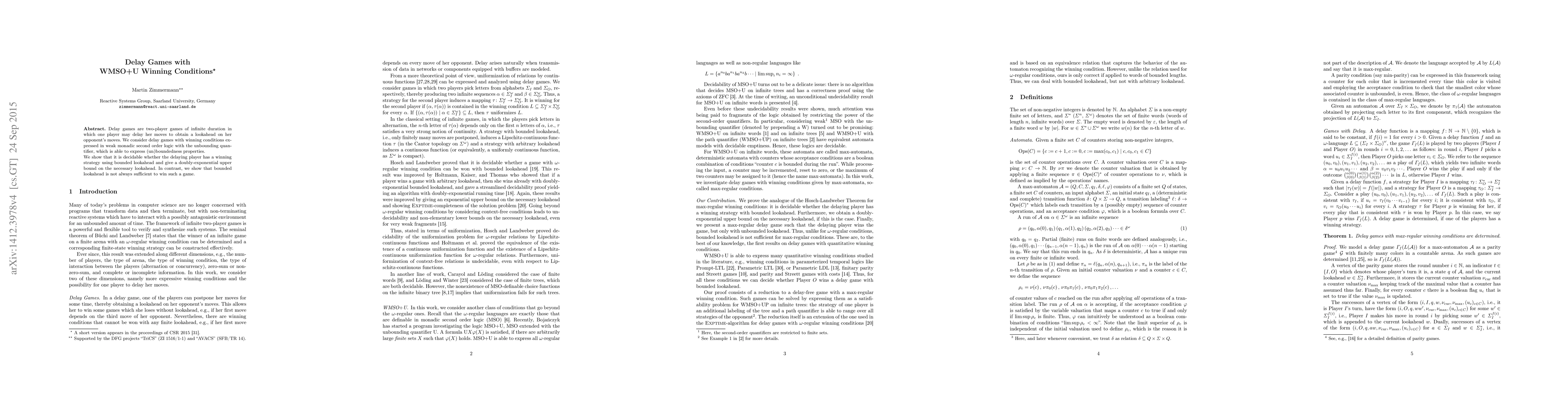 Delay games are two-player games of infinite duration in which one player may delay her moves to obtain a lookahead on her opponent's moves. We consider delay games with winning conditions expressed in weak monadic second order logic with the unbounding quantifier, which is able to express (un)boundedness properties. We show that it is decidable whether the delaying player has a winning strategy using bounded lookahead and give a doubly-exponential upper bound on the necessary lookahead. In contrast, we show that bounded lookahead is not always sufficient to win such a game.