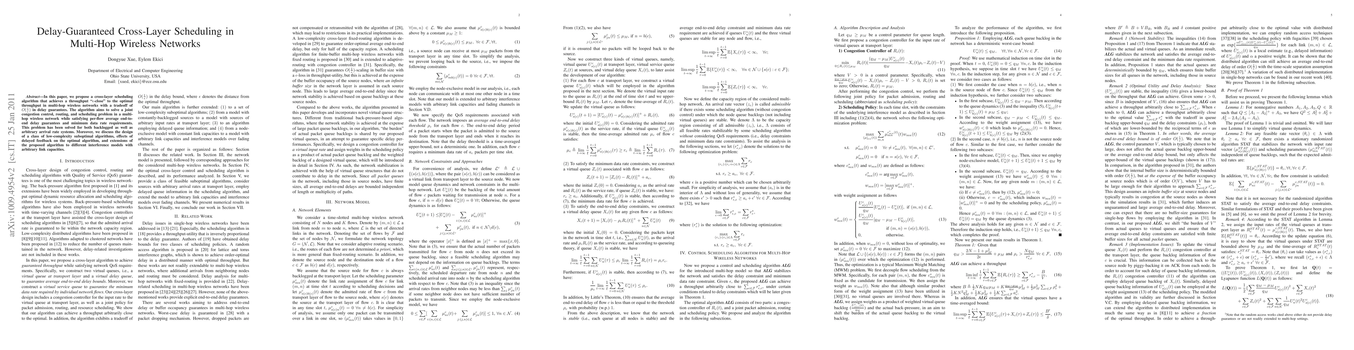 This paper introduces a cross-layer scheduling algorithm for multi-hop wireless networks that nearly achieves optimal throughput while providing delay guarantees. It addresses congestion control, routing, and scheduling jointly, ensuring per-flow delay and minimum data rate requirements, and explores low-complexity alternatives.