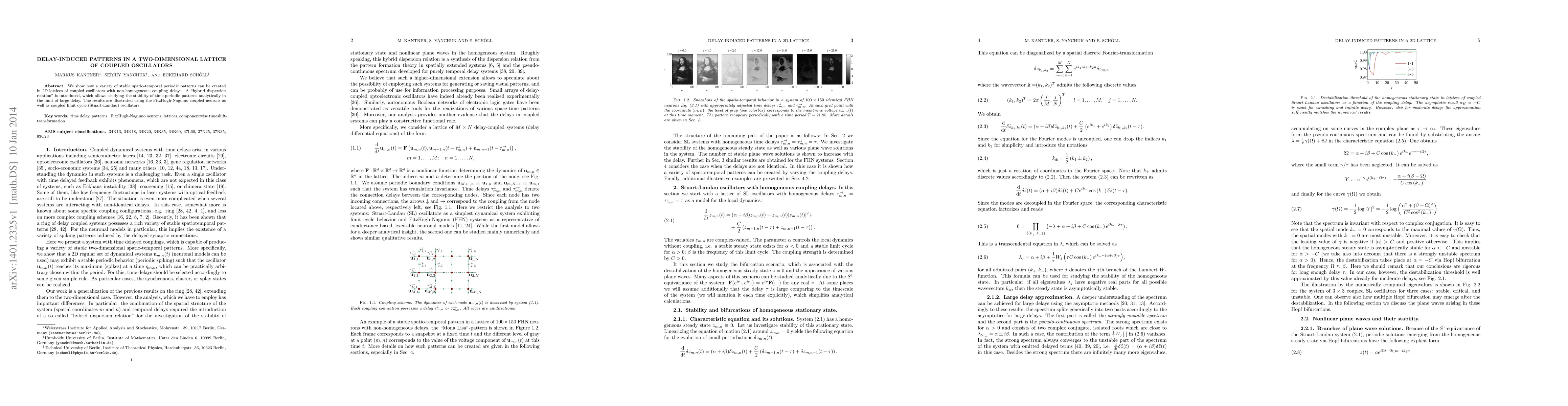 This paper investigates the emergence of stable spatio-temporal periodic patterns in 2D lattices of coupled oscillators with non-uniform coupling delays. A novel "hybrid dispersion relation" is developed to analytically study pattern stability in the large delay limit, demonstrating its application through FitzHugh-Nagumo neurons and Stuart-Landau oscillators.