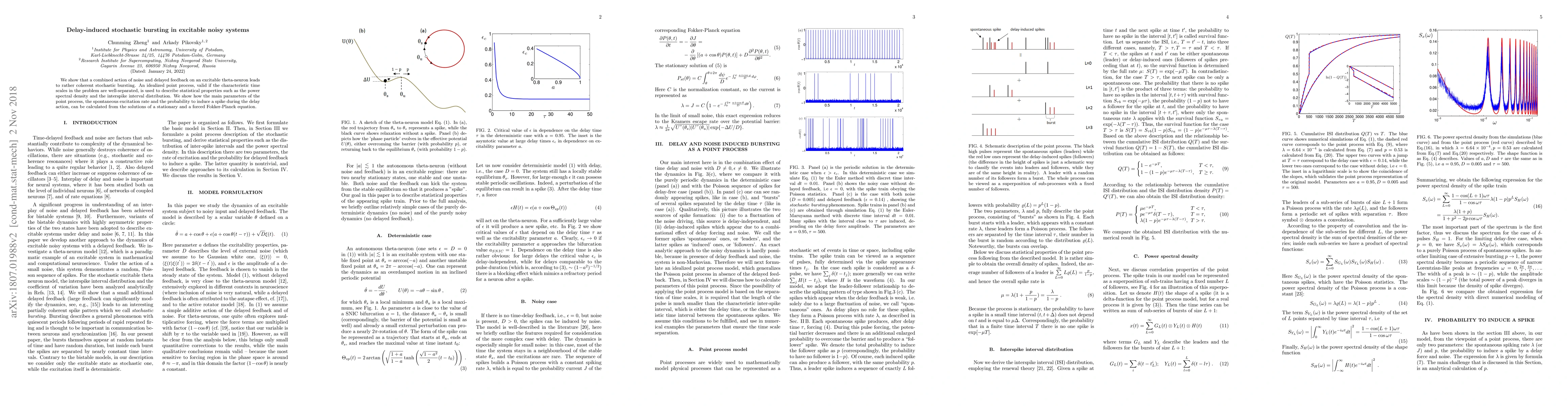 This paper investigates how noise and delayed feedback can induce coherent stochastic bursting in excitable theta-neuron systems. It uses an idealized point process to analyze statistical properties, deriving key parameters from solutions of stationary and forced Fokker-Planck equations.