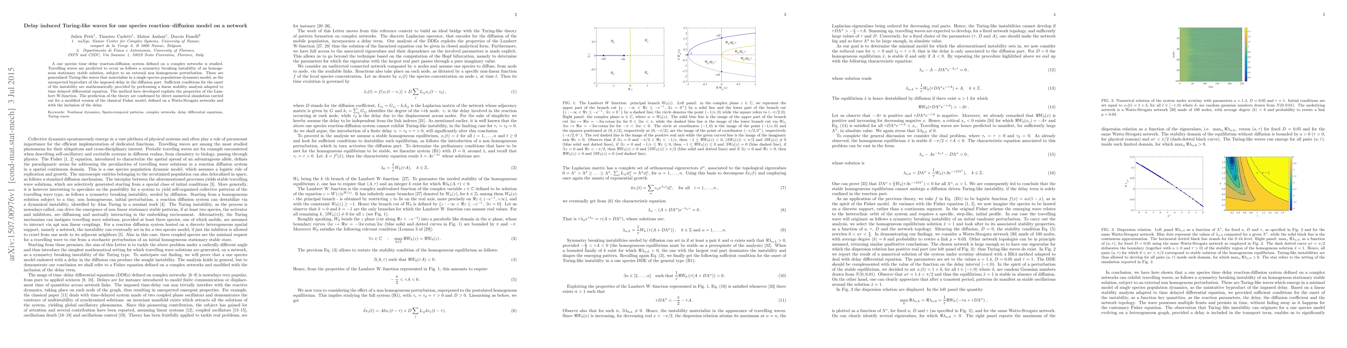 This paper explores a one-species reaction-diffusion model on complex networks, predicting the emergence of Turing-like waves due to symmetry breaking and time delays in diffusion. The study provides mathematical conditions for instability using a linear stability analysis and confirms theoretical predictions through numerical simulations on modified Fisher models on Watts-Strogatz networks.