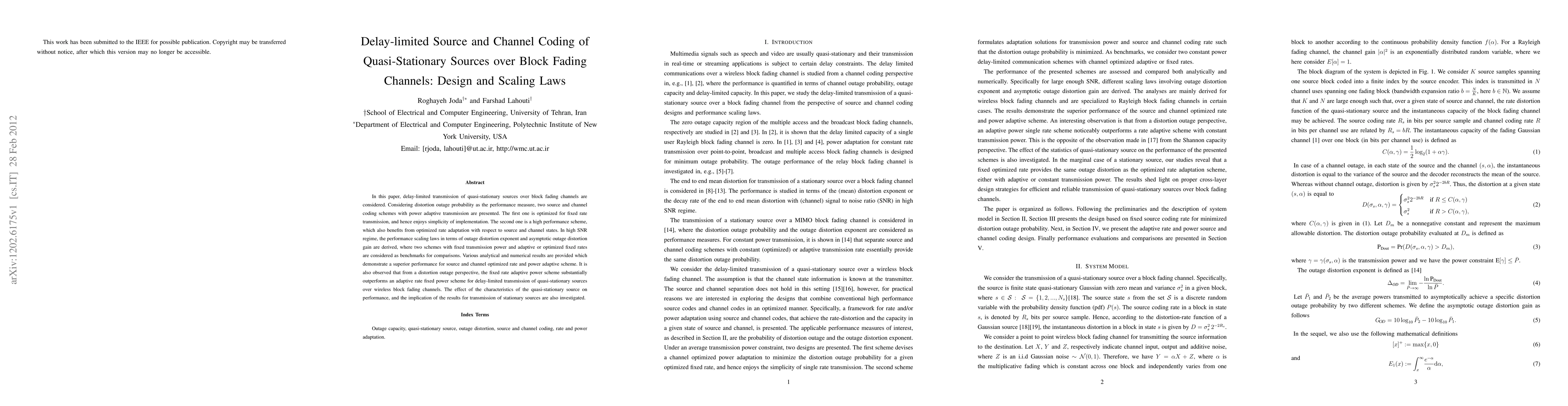 This paper explores delay-limited transmission of quasi-stationary sources over block fading channels, presenting two coding schemes: one simple fixed rate and one high-performance adaptive rate. Analytical and numerical results show superior performance of the adaptive scheme, especially in high SNR regimes, and highlight its advantages over fixed power adaptive rate schemes.