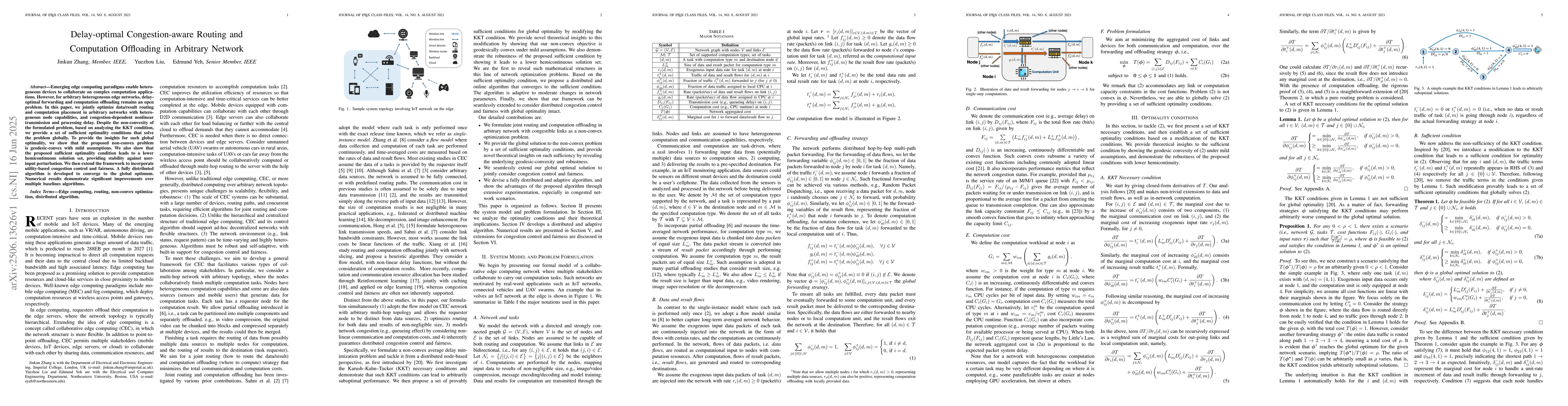 Emerging edge computing paradigms enable heterogeneous devices to collaborate on complex computation applications. However, for arbitrary heterogeneous edge networks, delay-optimal forwarding and computation offloading remains an open problem. In this paper, we jointly optimize data/result routing and computation placement in arbitrary networks with heterogeneous node capabilities, and congestion-dependent nonlinear transmission and processing delay. Despite the non-convexity of the formulated problem, based on analyzing the KKT condition, we provide a set of sufficient optimality conditions that solve the problem globally. To provide the insights for such global optimality, we show that the proposed non-convex problem is geodesic-convex with mild assumptions. We also show that the proposed sufficient optimality condition leads to a lower hemicontinuous solution set, providing stability against user-input perturbation. We then extend the framework to incorporate utility-based congestion control and fairness. A fully distributed algorithm is developed to converge to the global optimum. Numerical results demonstrate significant improvements over multiple baselines algorithms.