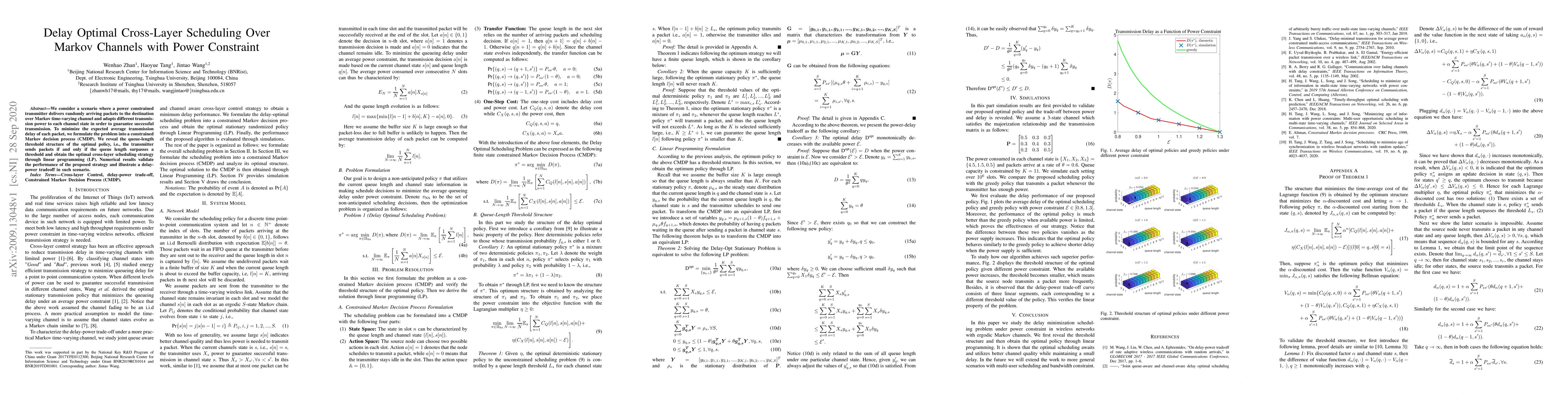 Researchers developed a method to minimize packet delay in wireless networks with power constraints over time-varying channels. They found that the optimal policy involves sending packets only when the queue length exceeds a certain threshold, using linear programming to optimize transmission power.