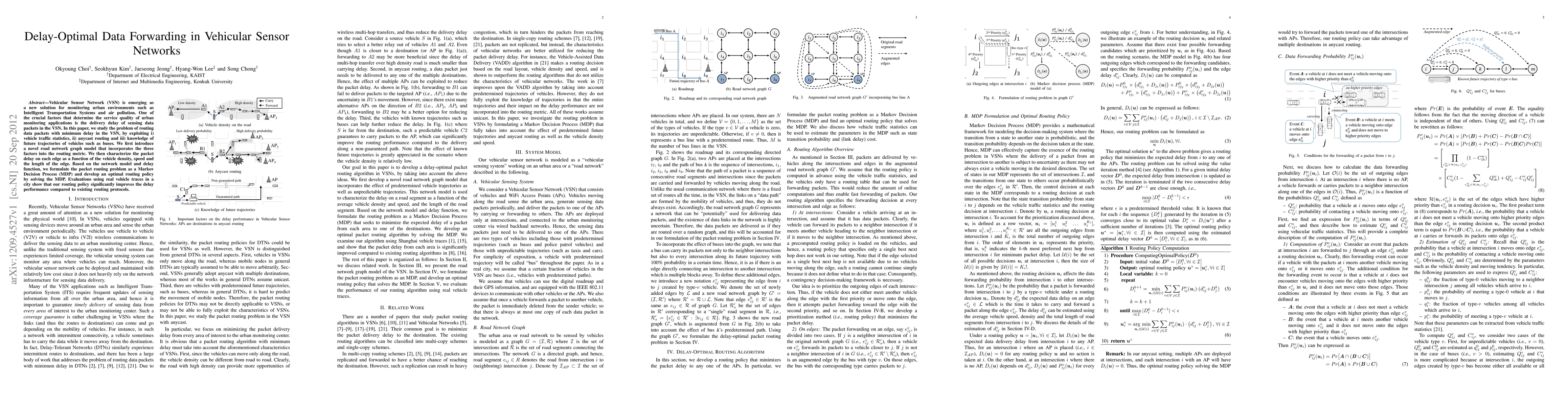 This paper proposes a delay-optimal routing strategy for Vehicular Sensor Networks (VSN) by integrating vehicle traffic statistics, anycast routing, and future vehicle trajectories. The authors develop a novel road network graph model and formulate the routing problem as a Markov Decision Process, achieving significant delay performance improvements over existing protocols, as demonstrated by evaluations using real vehicle data.