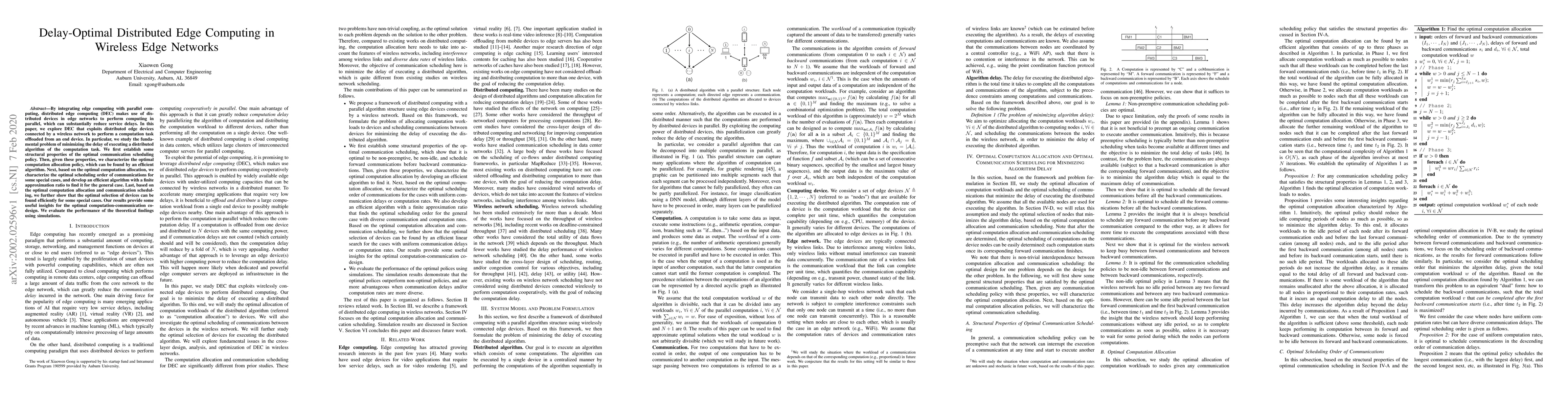 This paper investigates delay-optimal distributed edge computing in wireless networks, focusing on minimizing the execution delay of computation tasks offloaded from end devices. It develops efficient algorithms for optimal computation allocation, communication scheduling, and device selection, providing insights for computation-communication co-design and validating results through simulations.